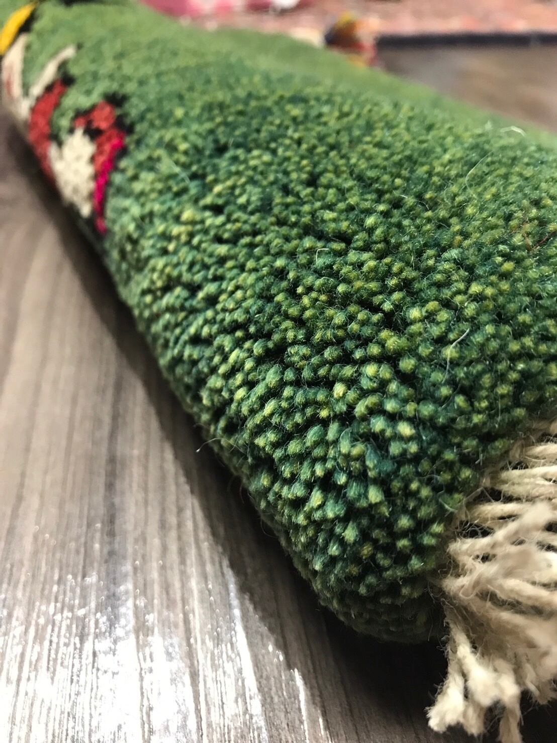 イランのギャッべの特徴は遊牧民の暮らしている地域は夏冬の温度差が大きい事に加え乾燥地帯であるため昼夜の温度差も大きい環境で育った羊の毛を刈り紡いで使っているので良質なウールで出来ていて手触りが良いです。