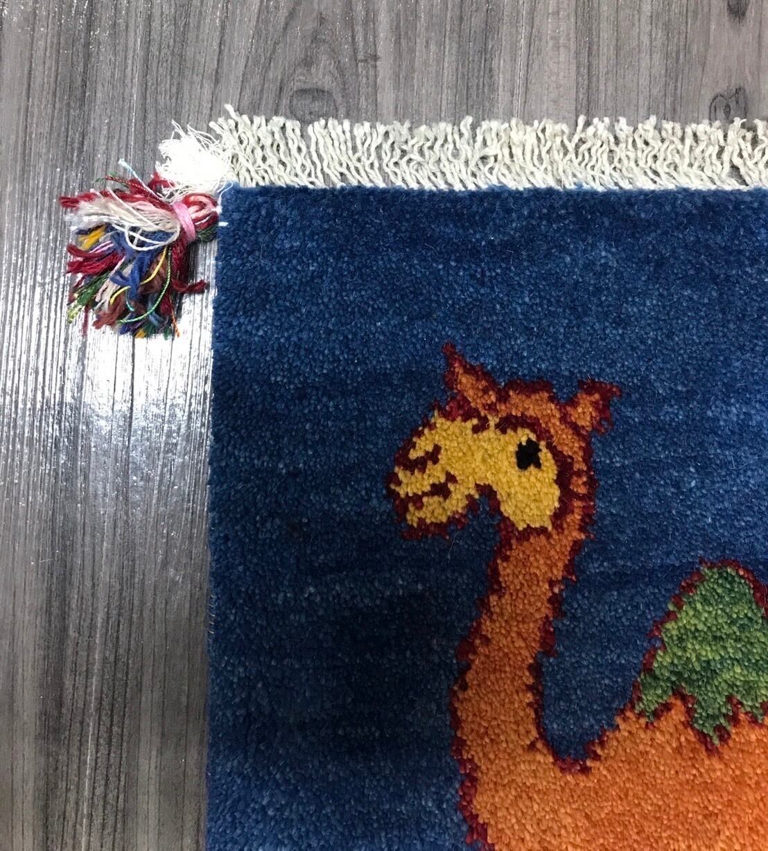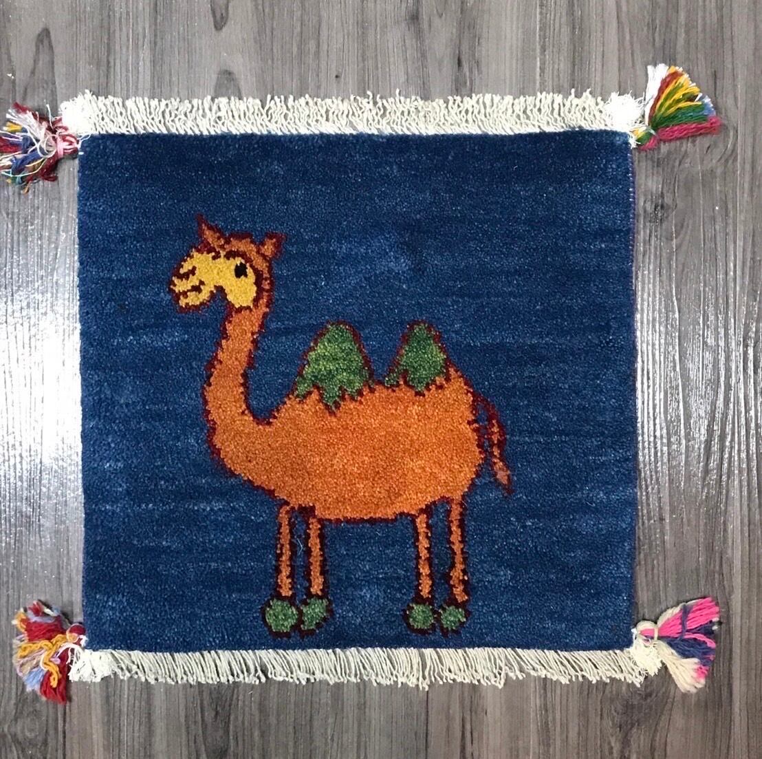 ブルーのフィールドに可愛らしいラクダの姿にほっこりするような可愛らしい座布団サイズの手織りペルシャギャッベです。