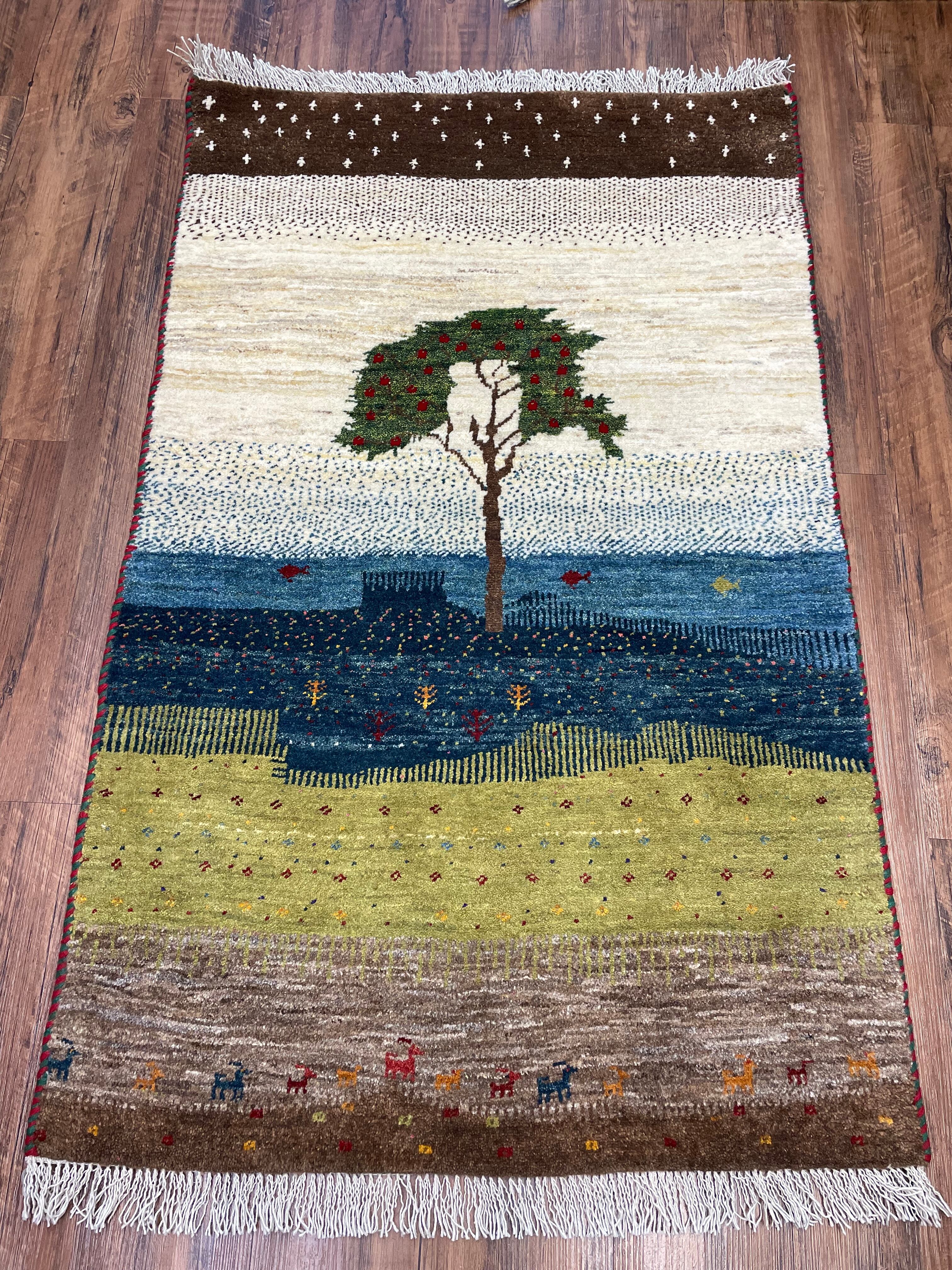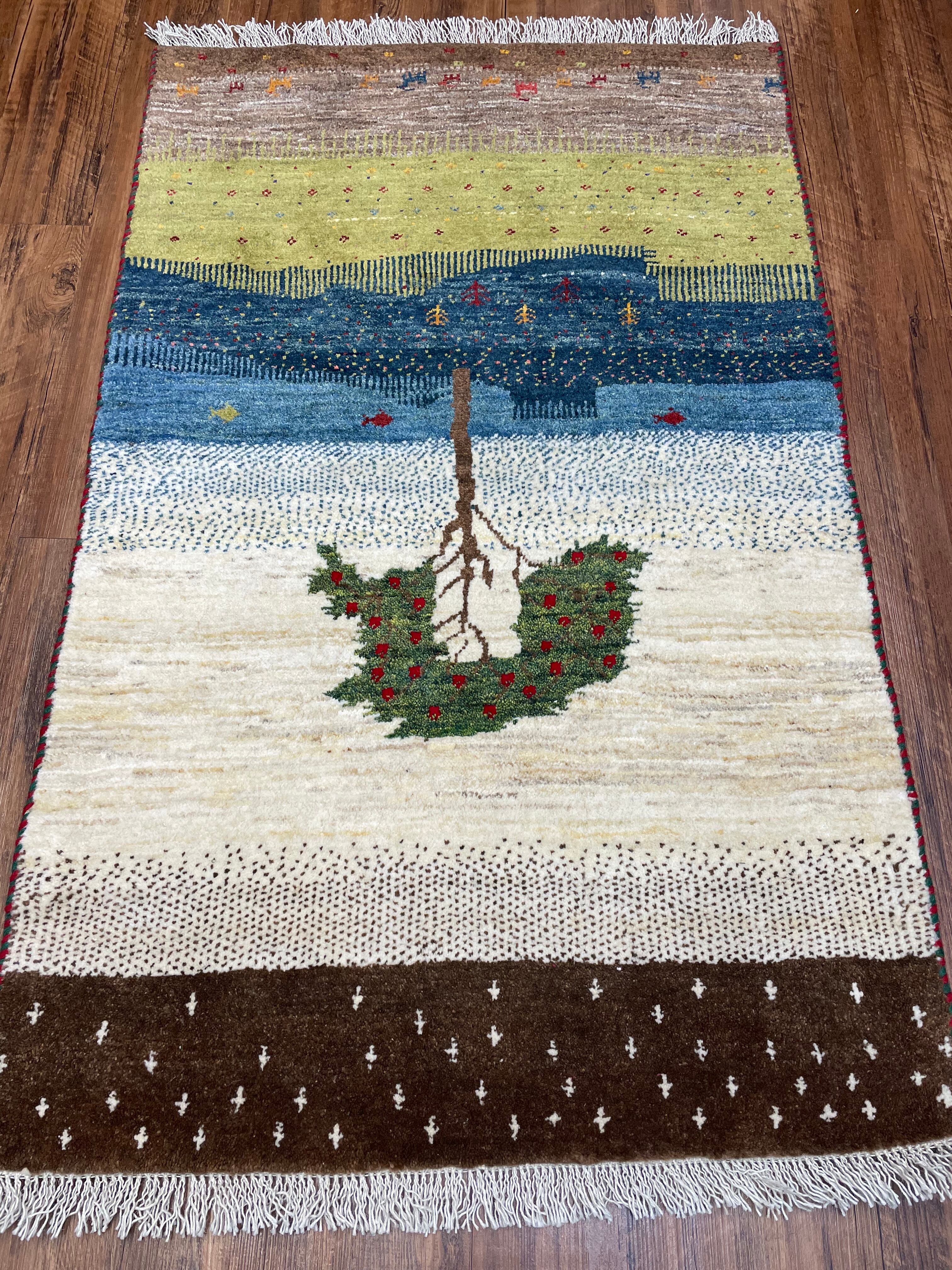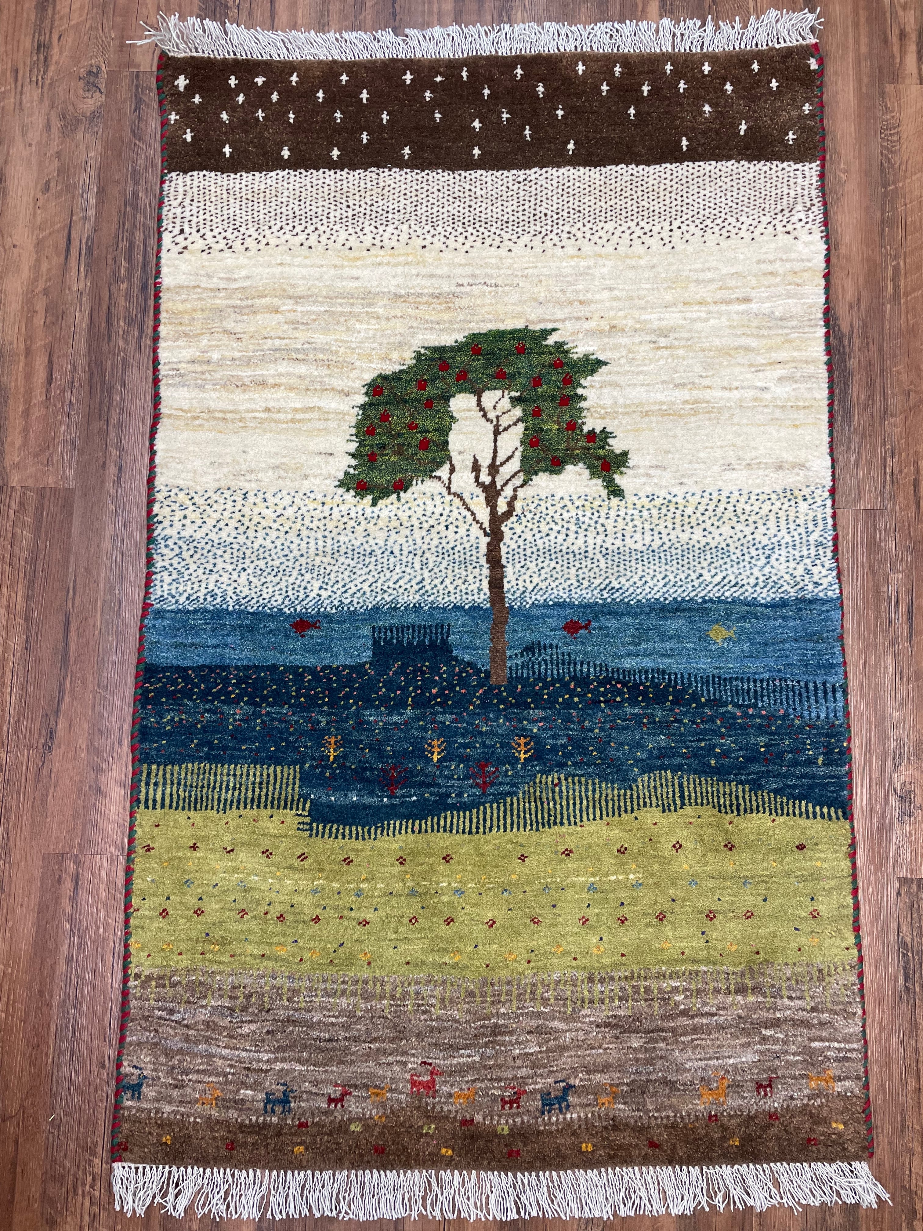 新品 ペルシャ絨毯 手織り リズ ギャッベ 123×78cm 風景 ザクロの木 魚 山羊