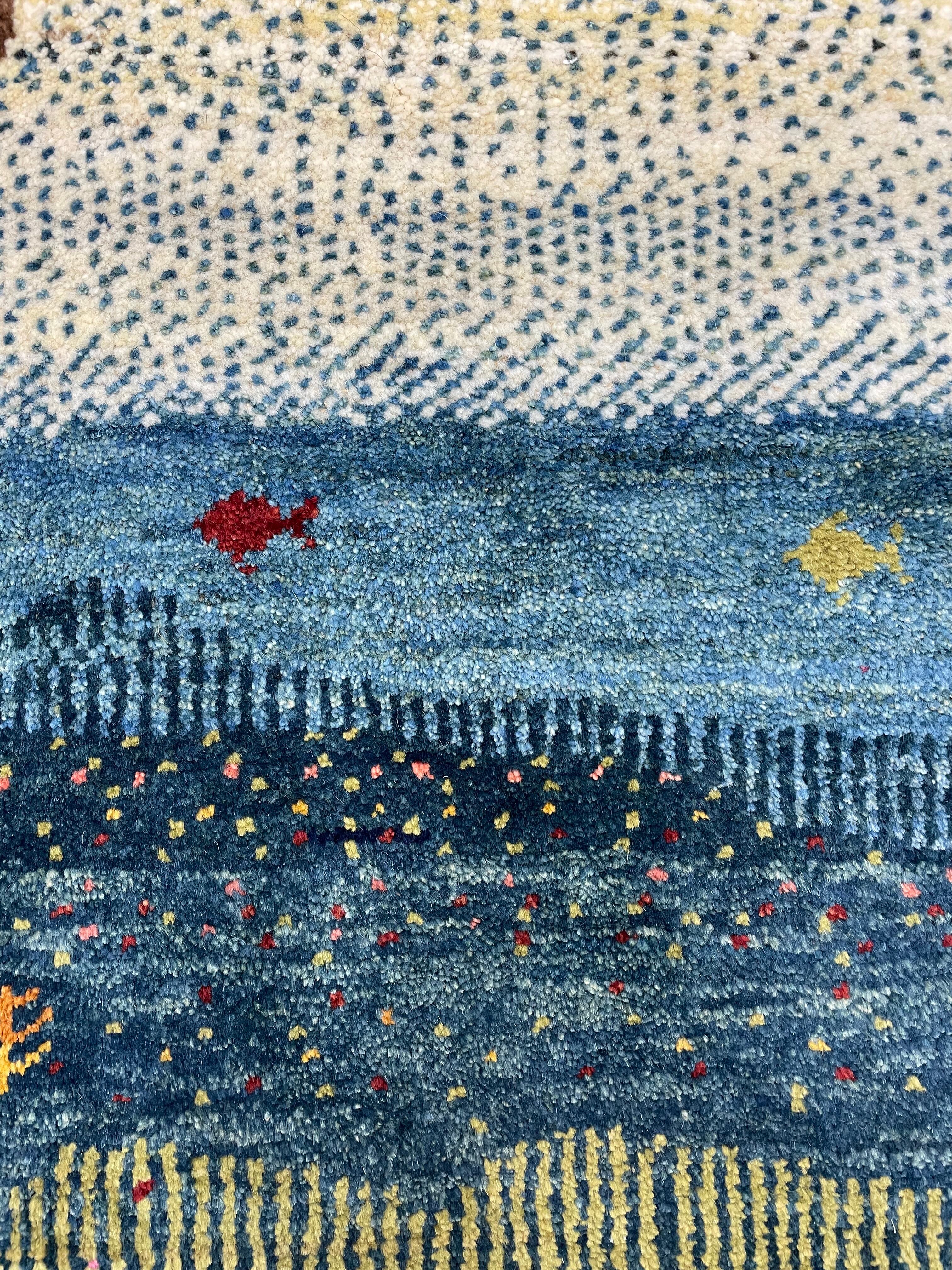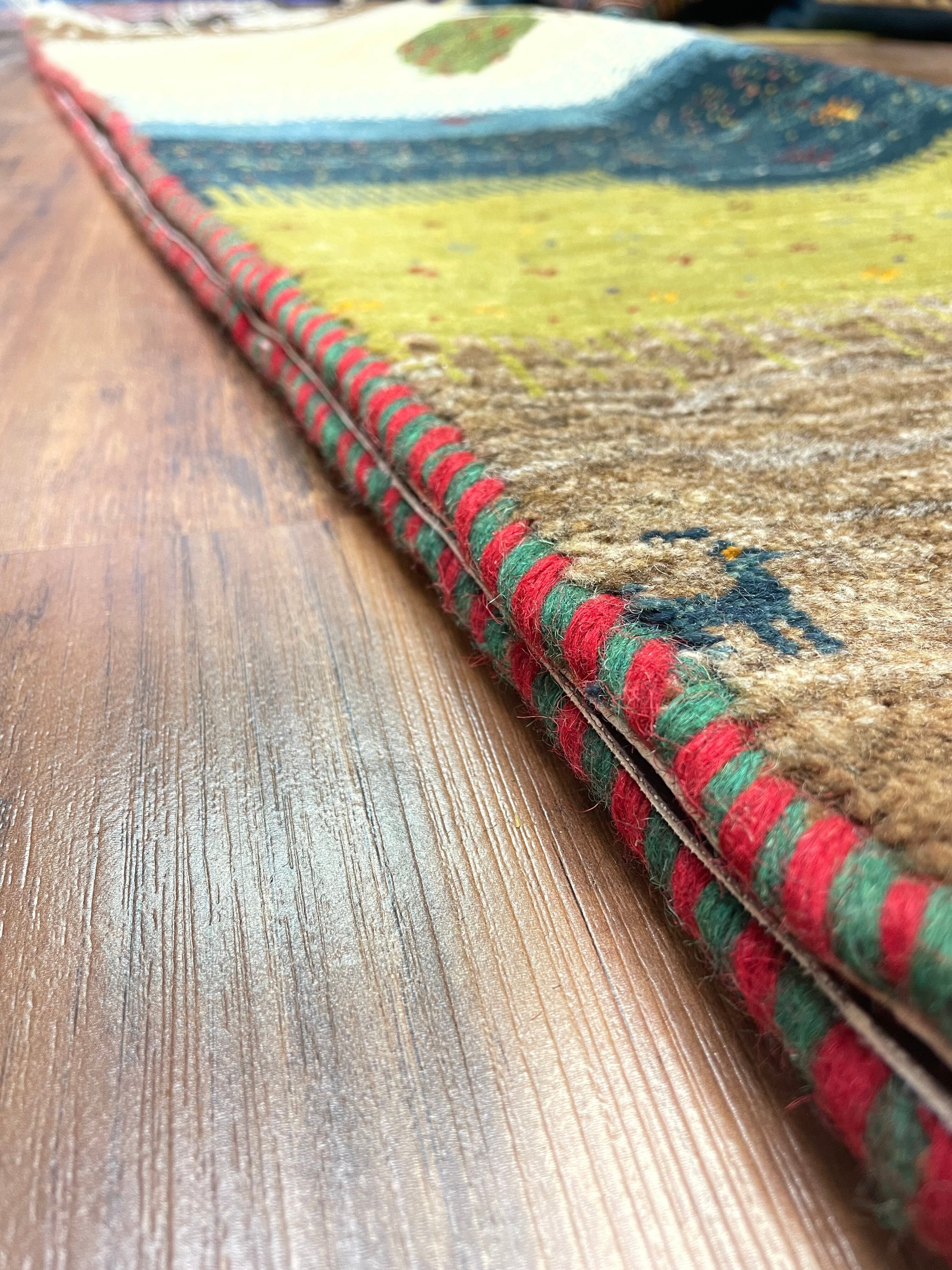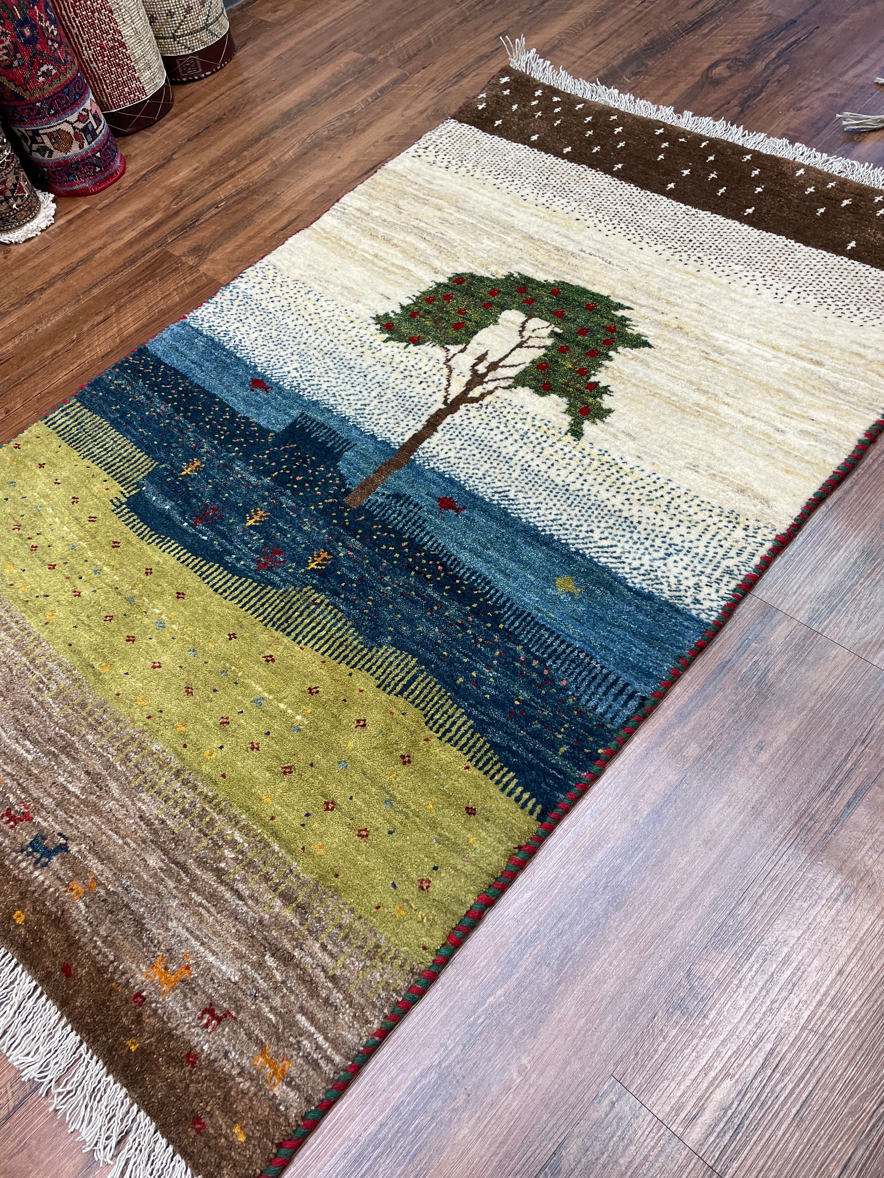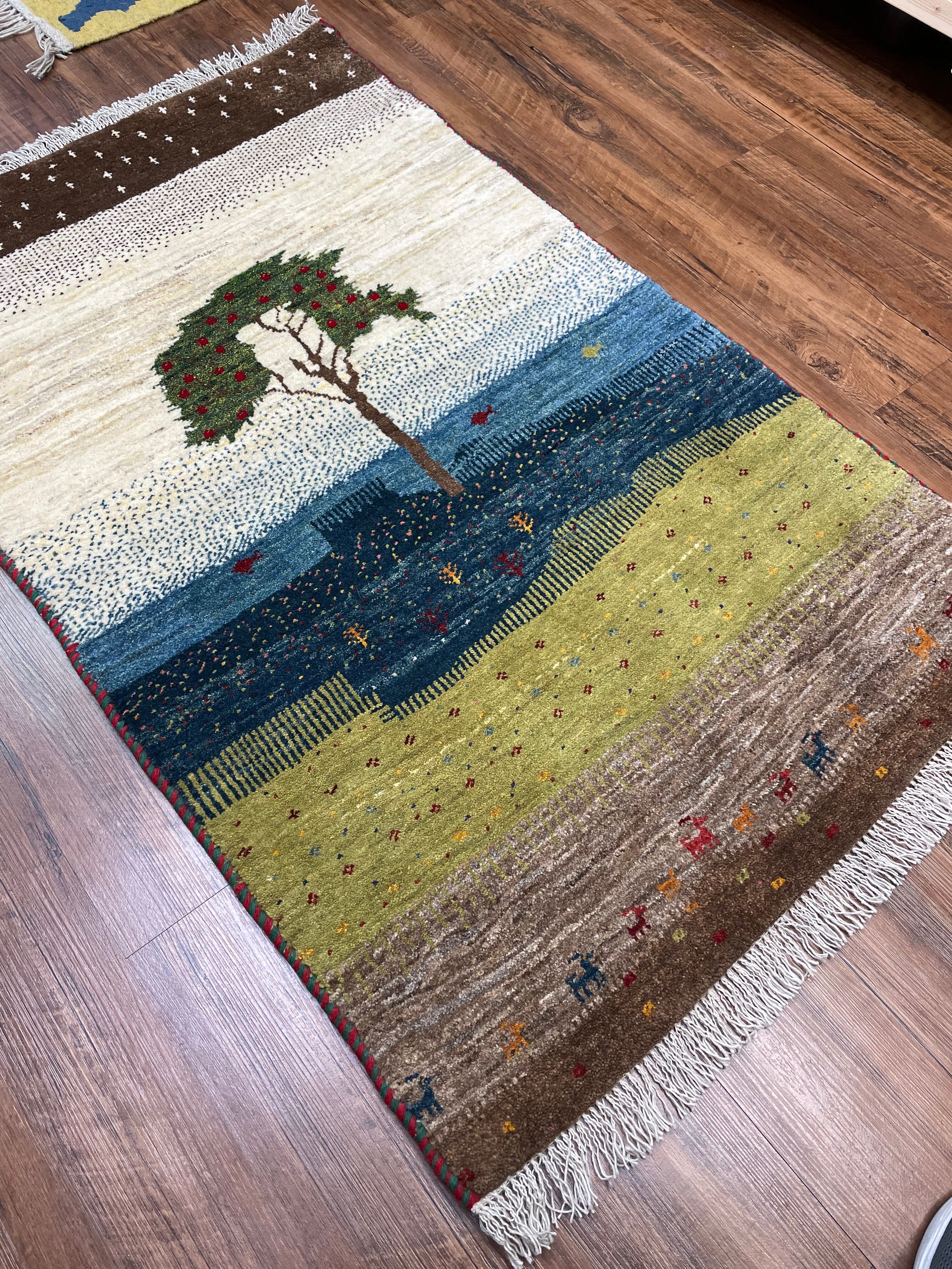 新品 ペルシャ絨毯 手織り リズ ギャッベ 123×78cm 風景 ザクロの木 魚 山羊