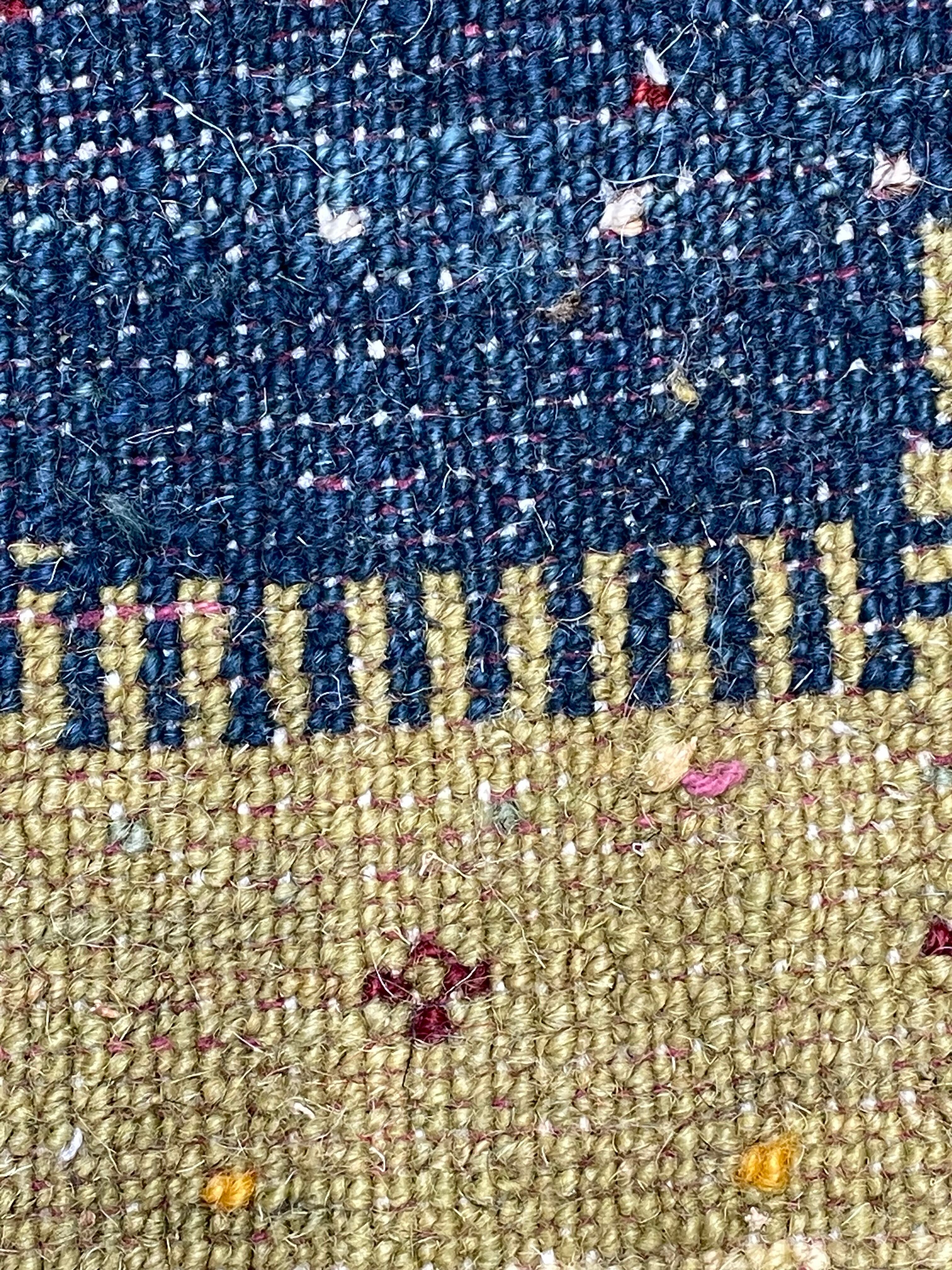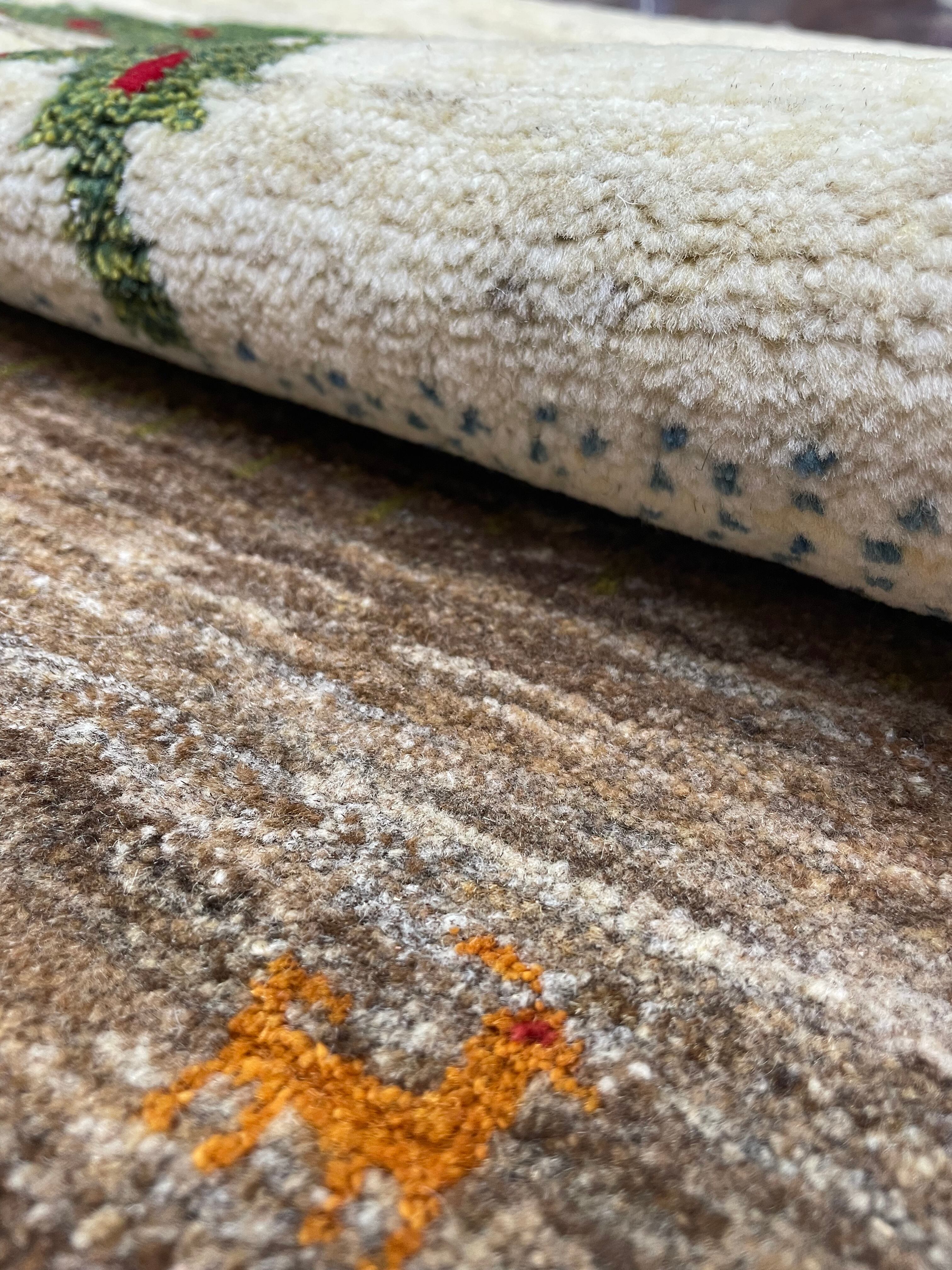質の良いウールを手で紡ぎ、草木染めしたウールで織り上げているので艶さも感じられ、見る方向や角度で、色味が明るく出たり濃く出たりと楽しめるギャッベです。