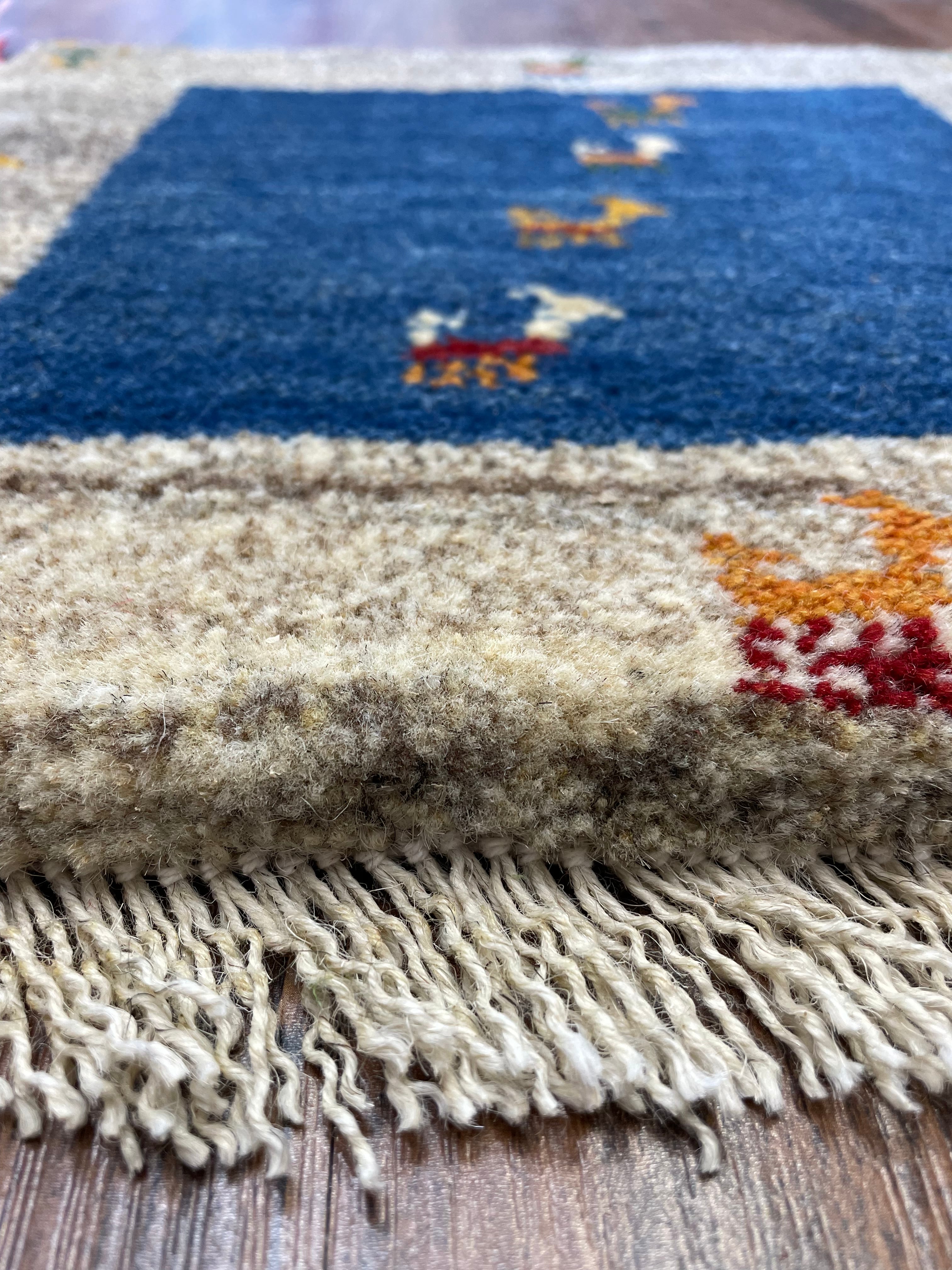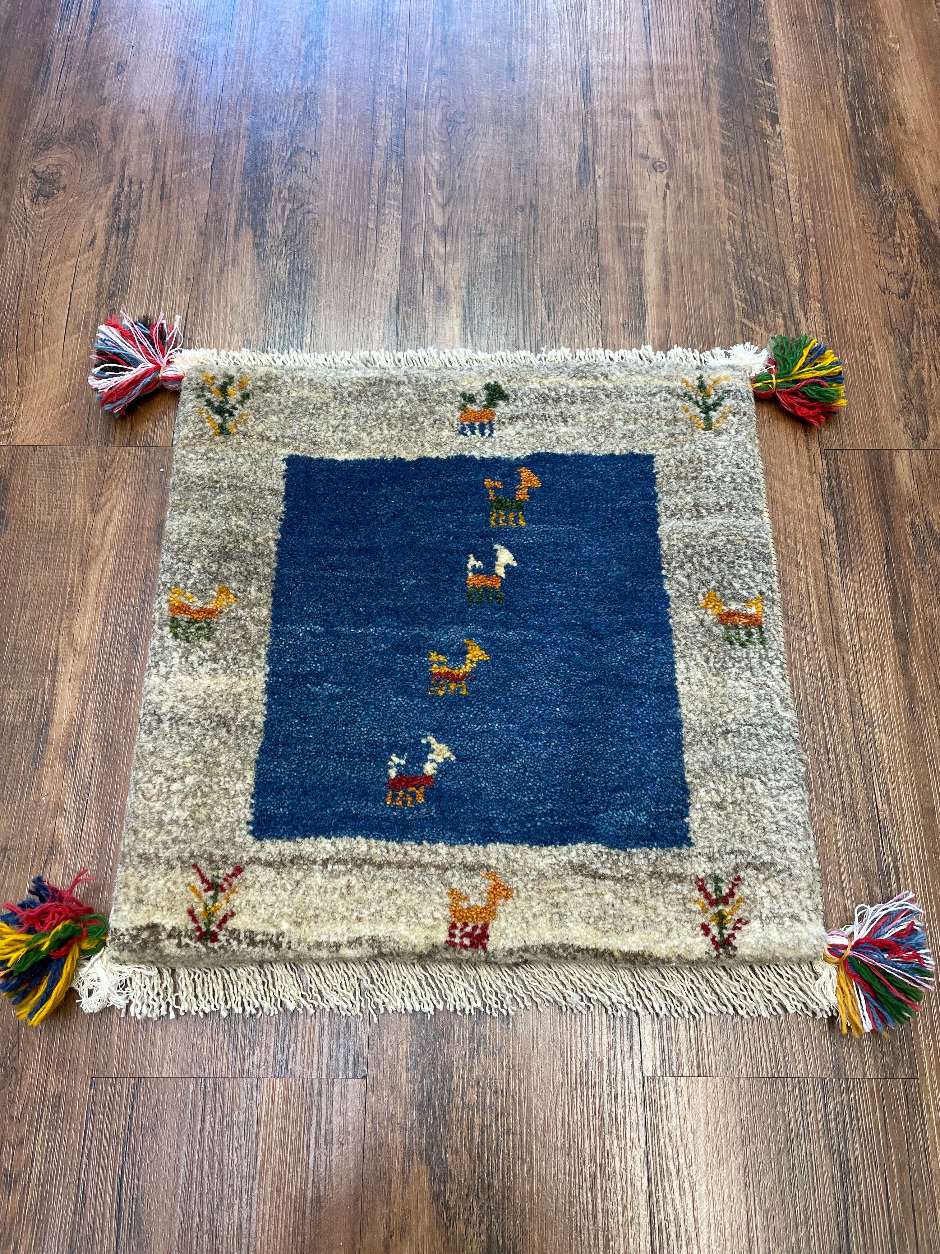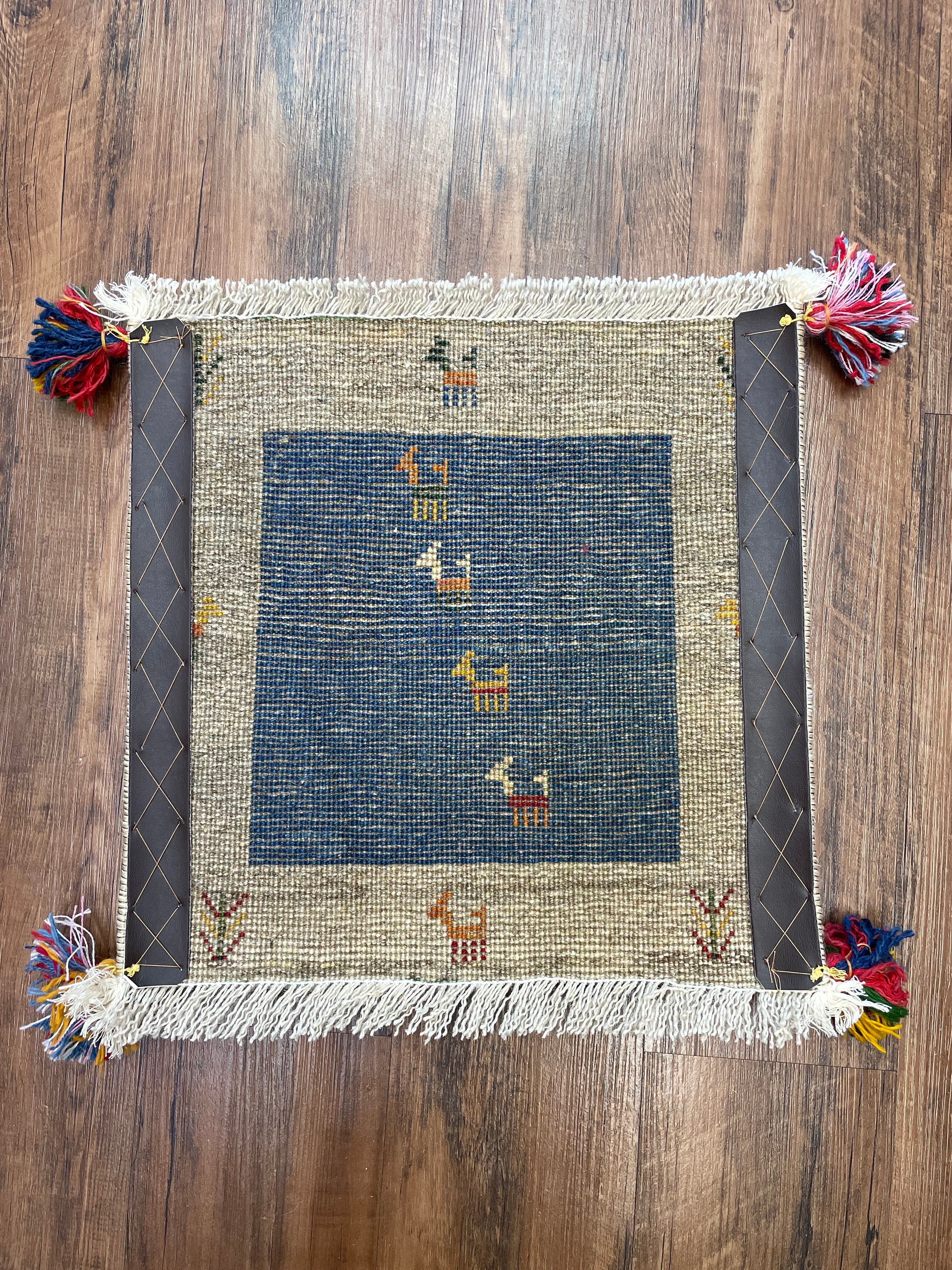 新品 ペルシャ絨毯 手織り ギャッベ 40×41cm ナチュラル 青 山羊