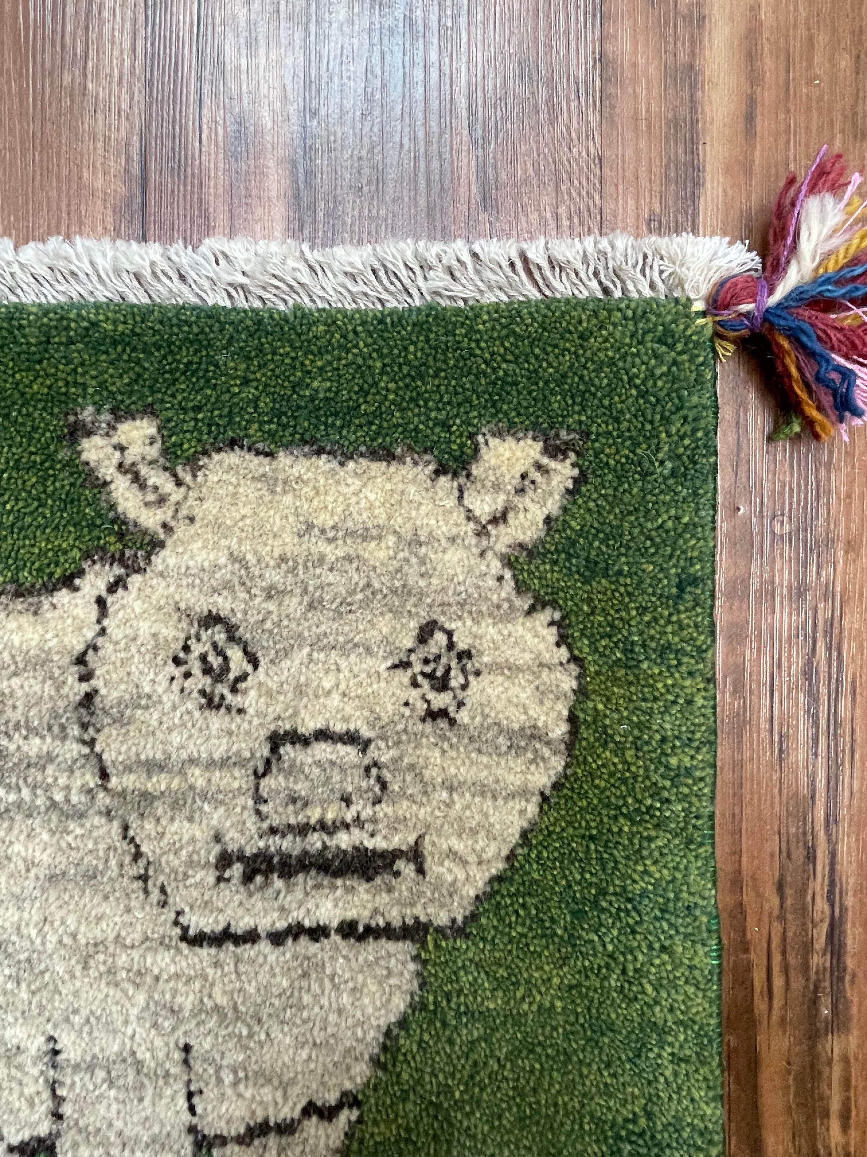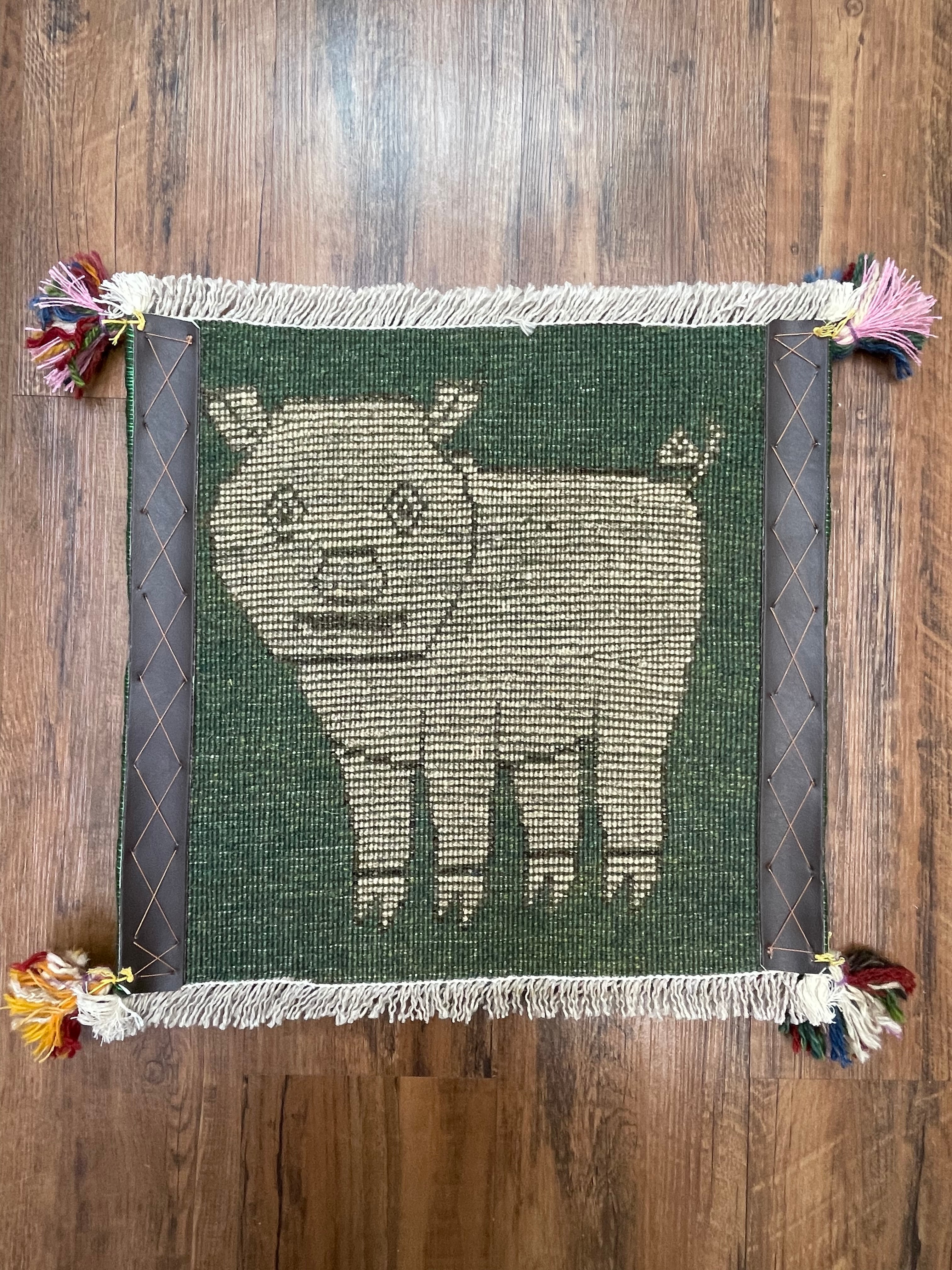 くるっとした丸まった小さなしっぽがチャームポイントのブタさん、びっくりしたような表情でこちらを見ているようでとっても可愛いモチーフの座布団サイズの手織りペルシャギャッベです。