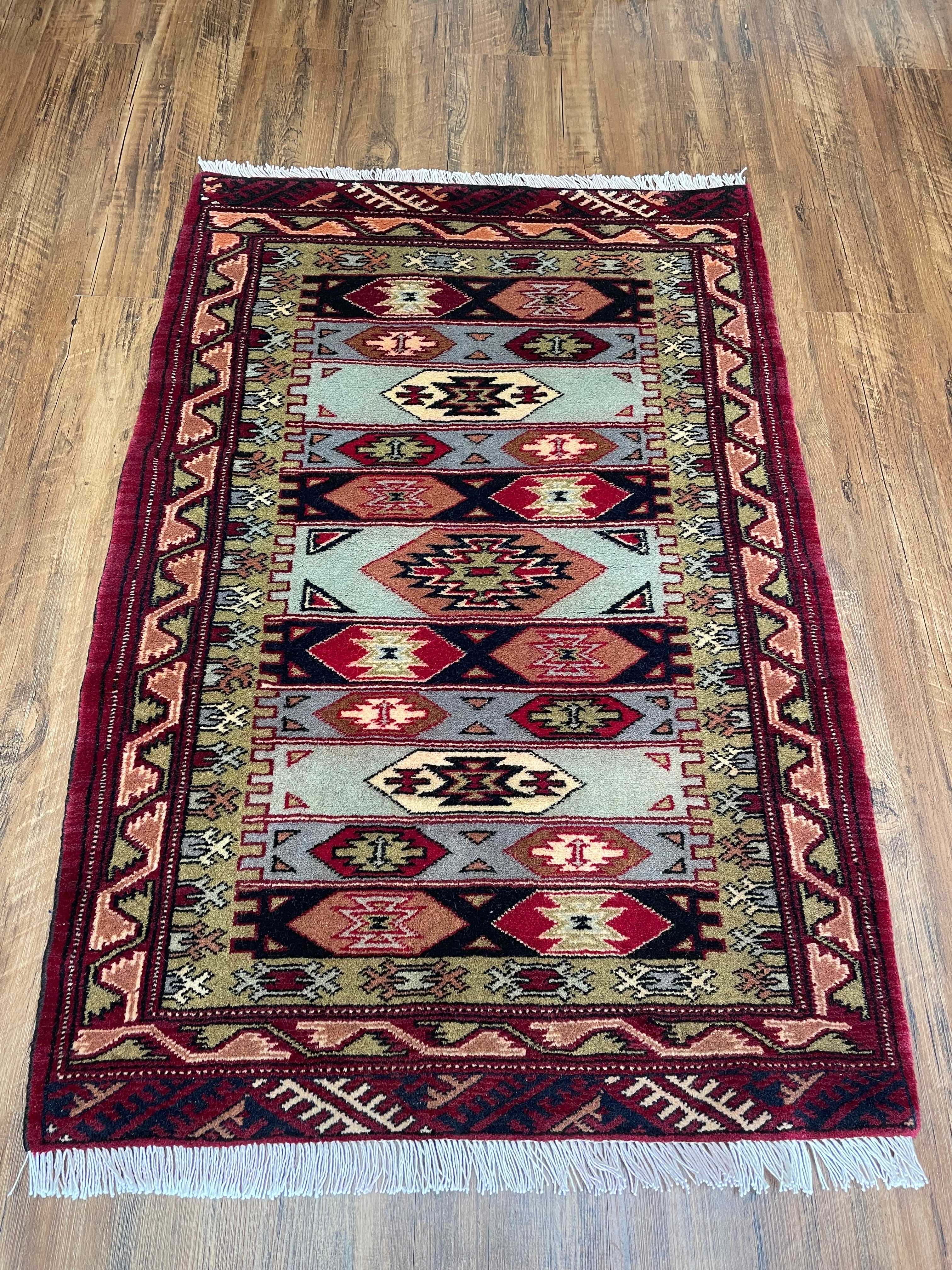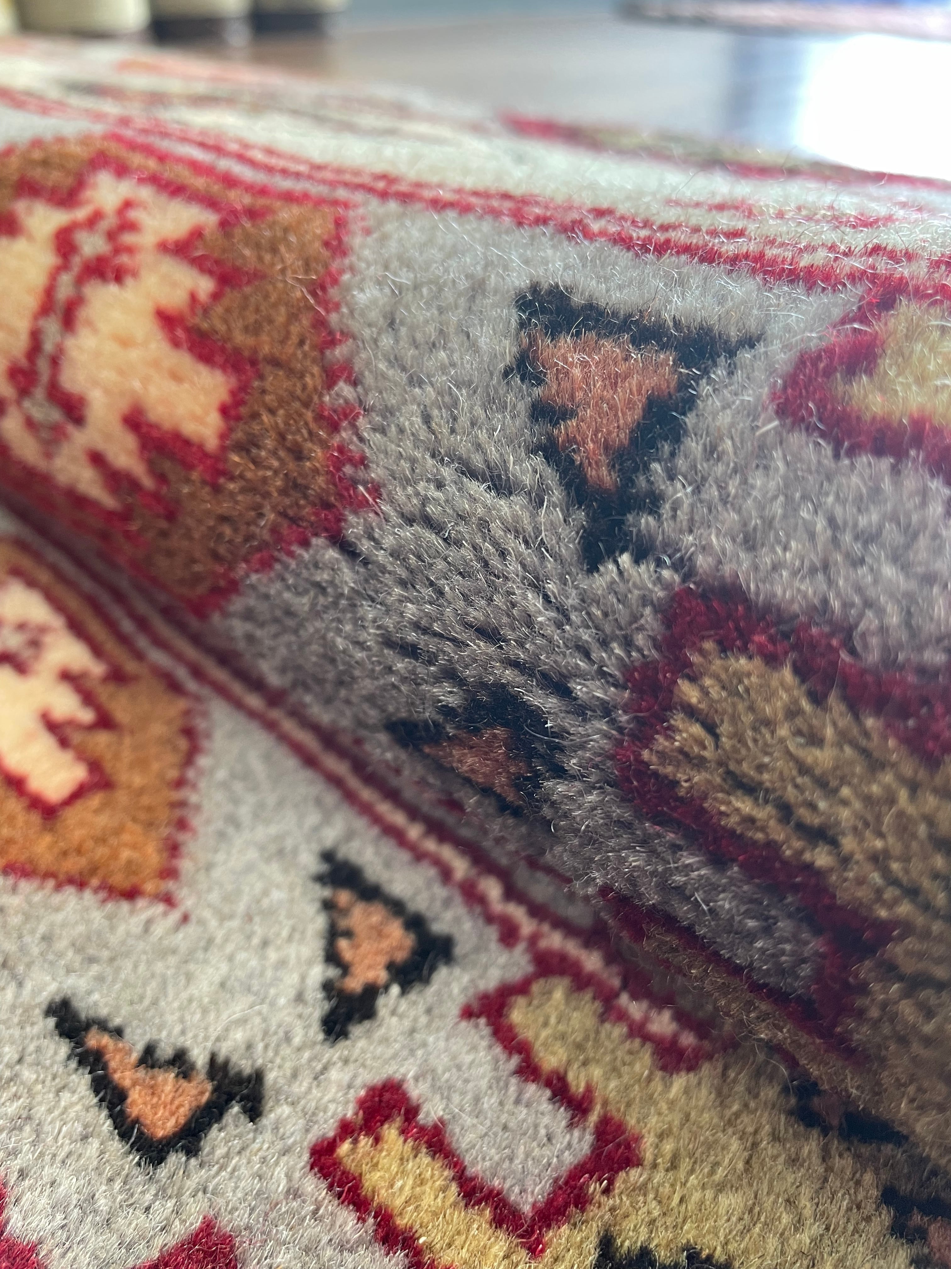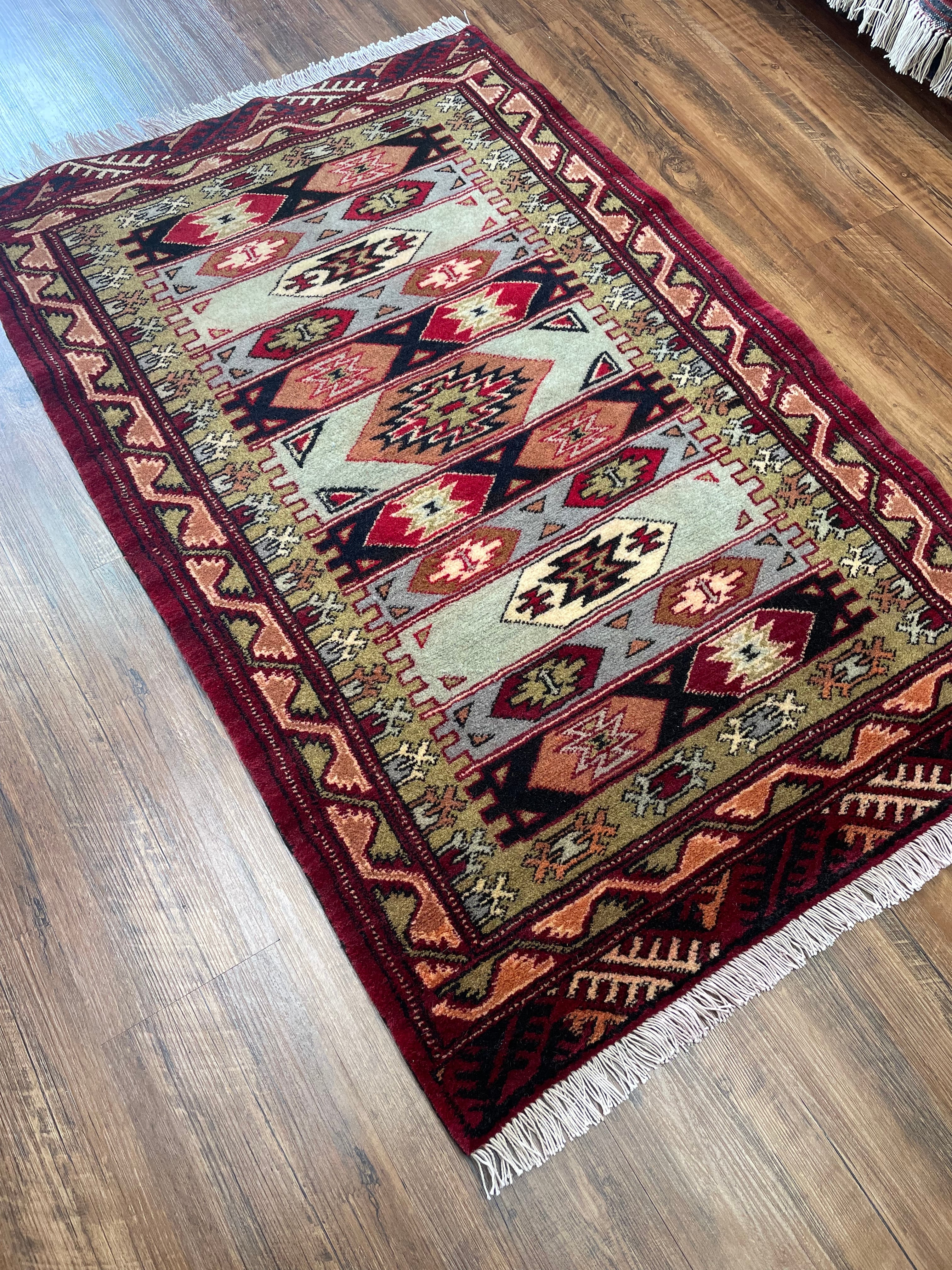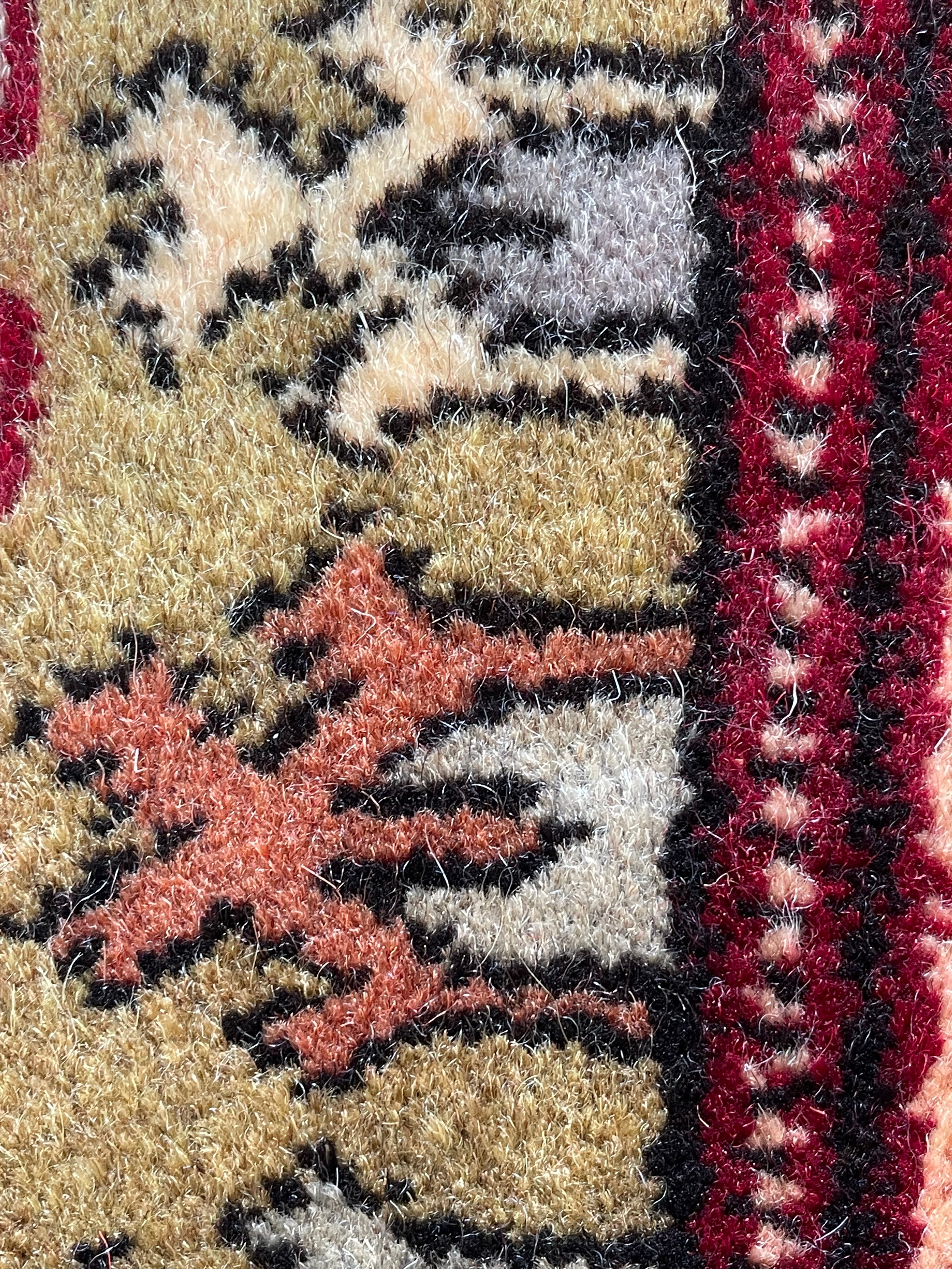 草木染めされた色味がとてもきれいで、反対色の絶妙な組み合わせが印象的なトルキャマン産のペルシャ絨毯です。