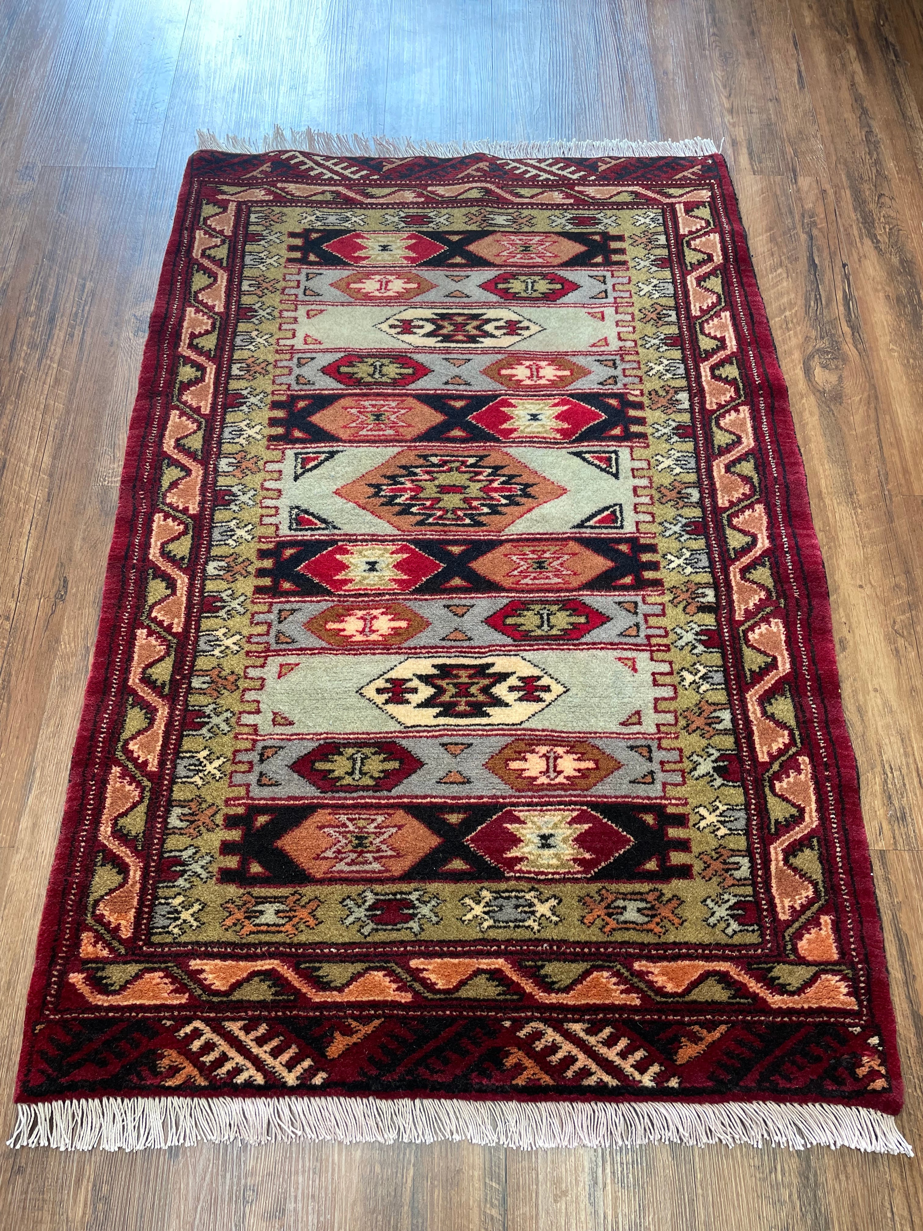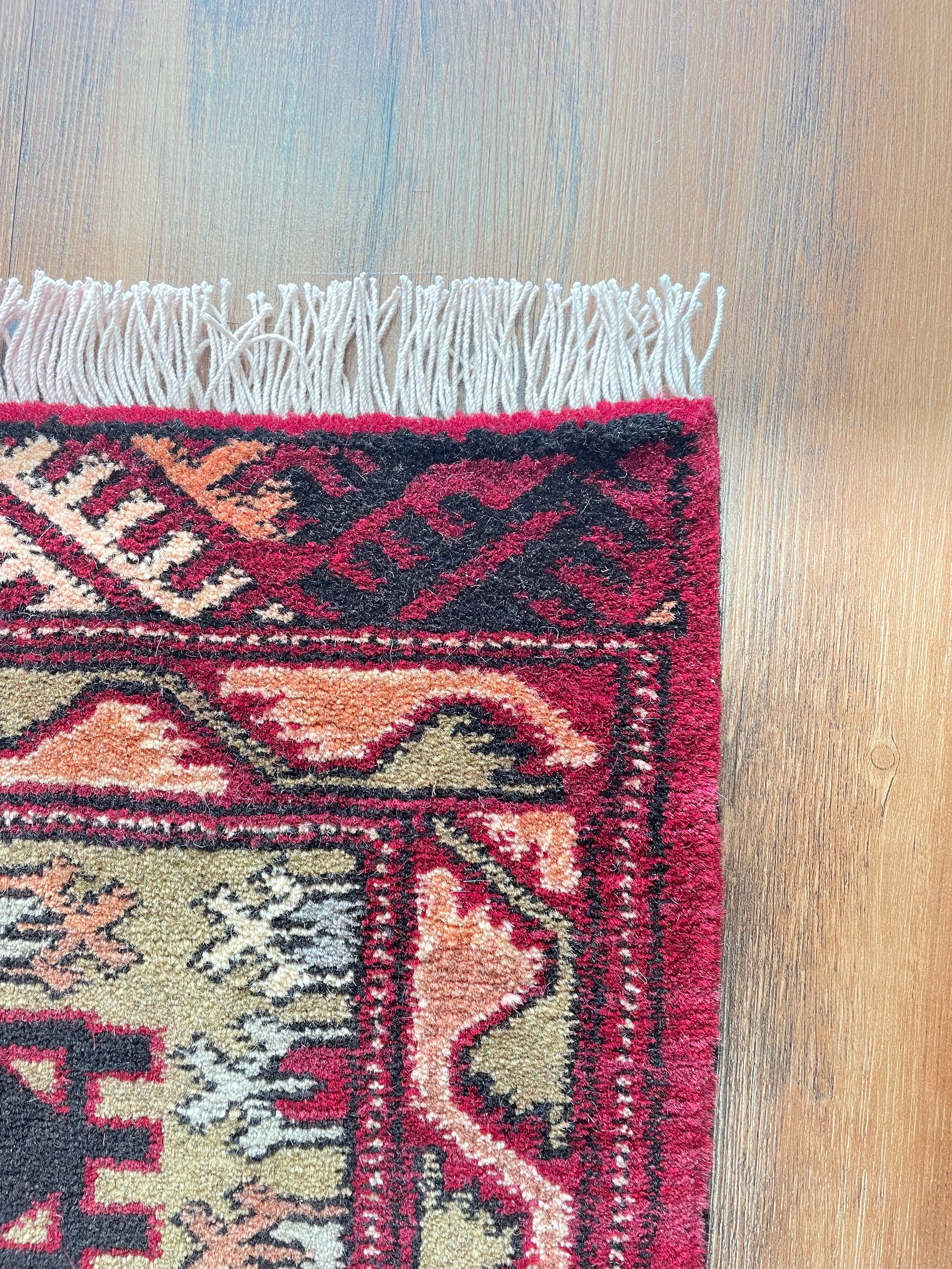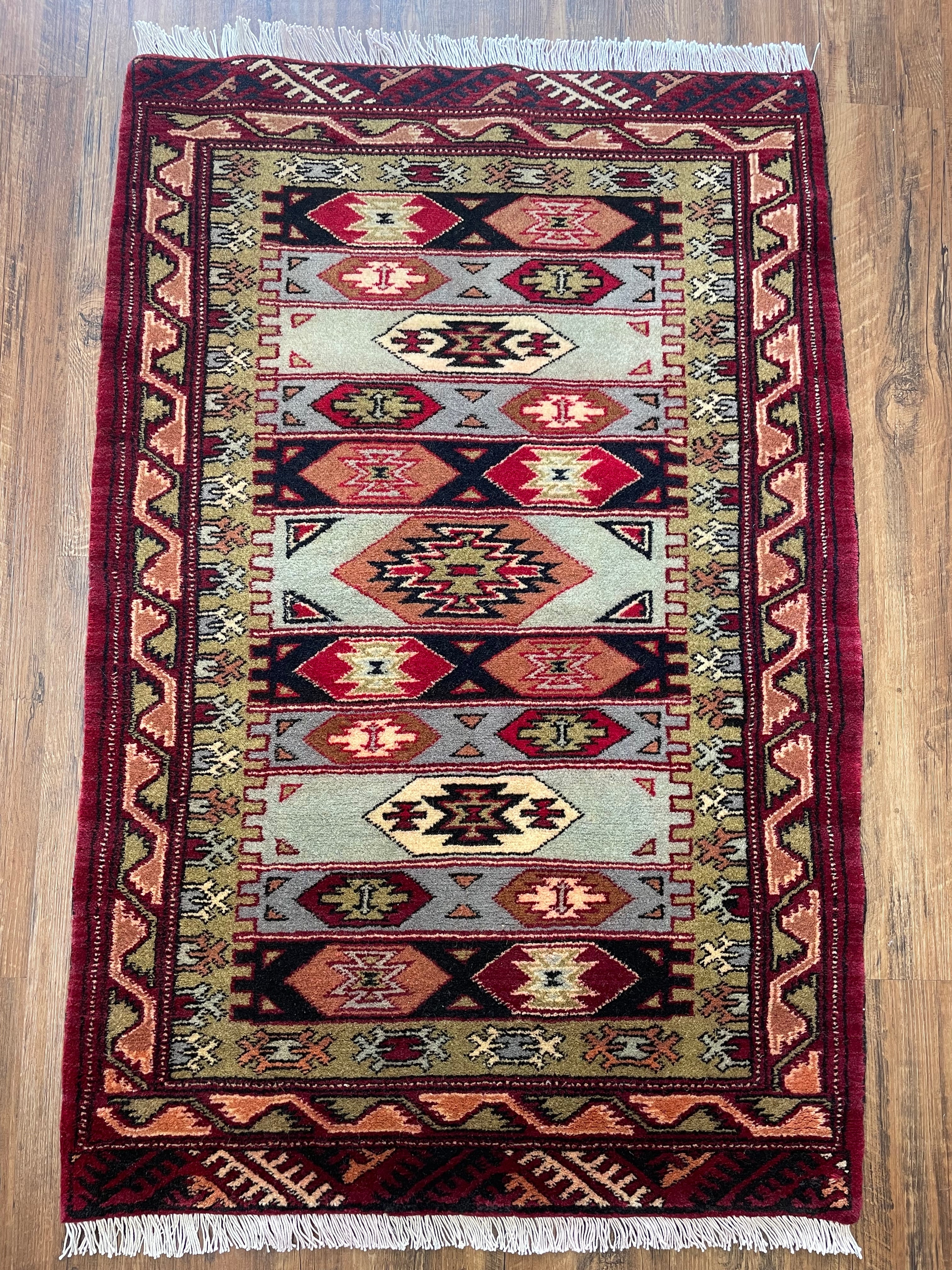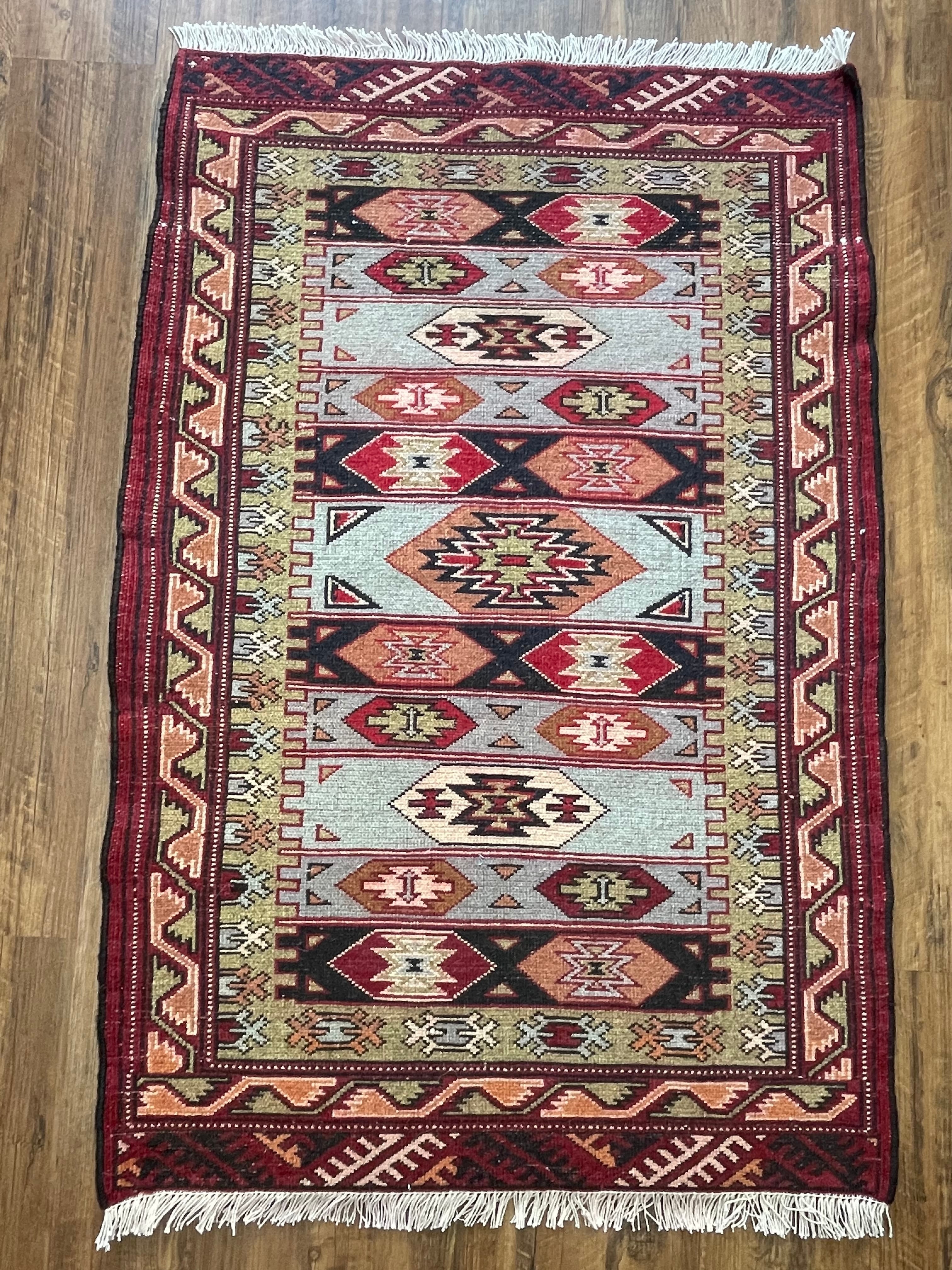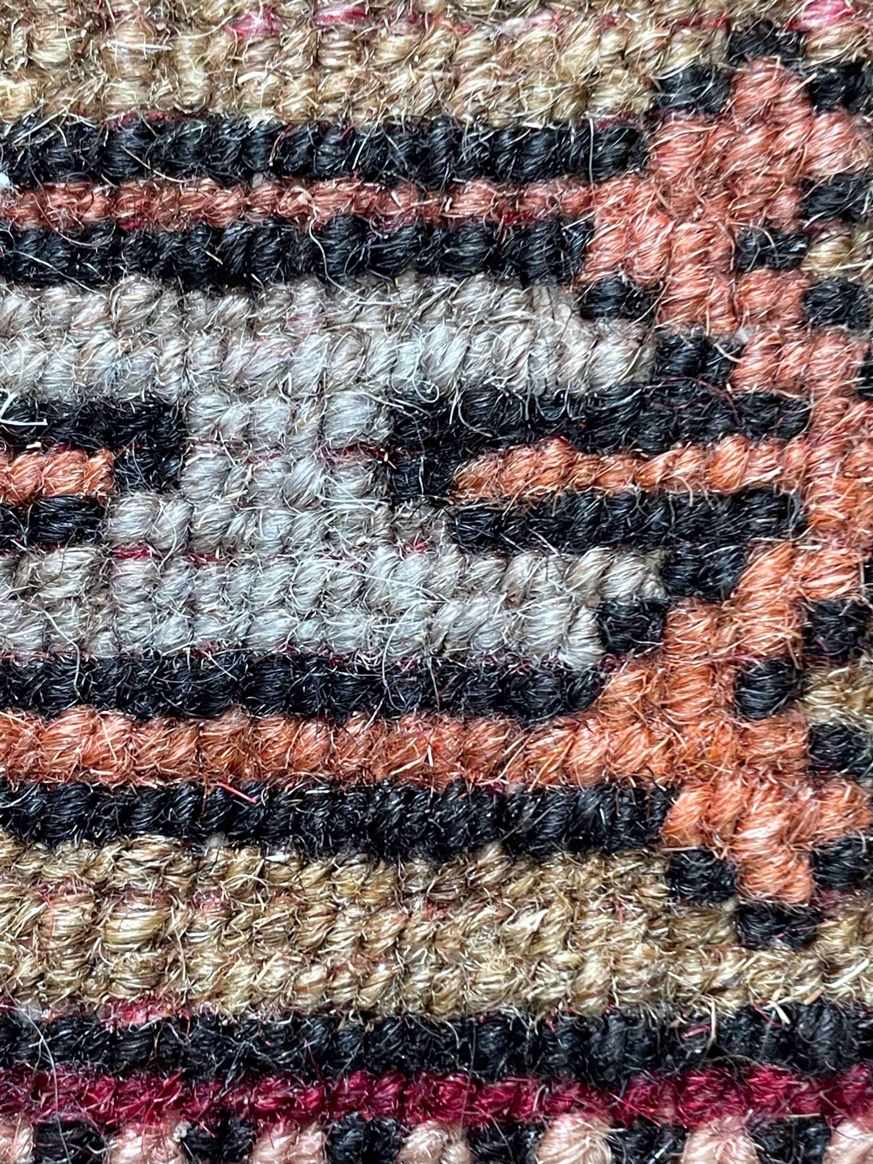 草木染めされた色味がとてもきれいで、反対色の絶妙な組み合わせが印象的なトルキャマン産のペルシャ絨毯です。