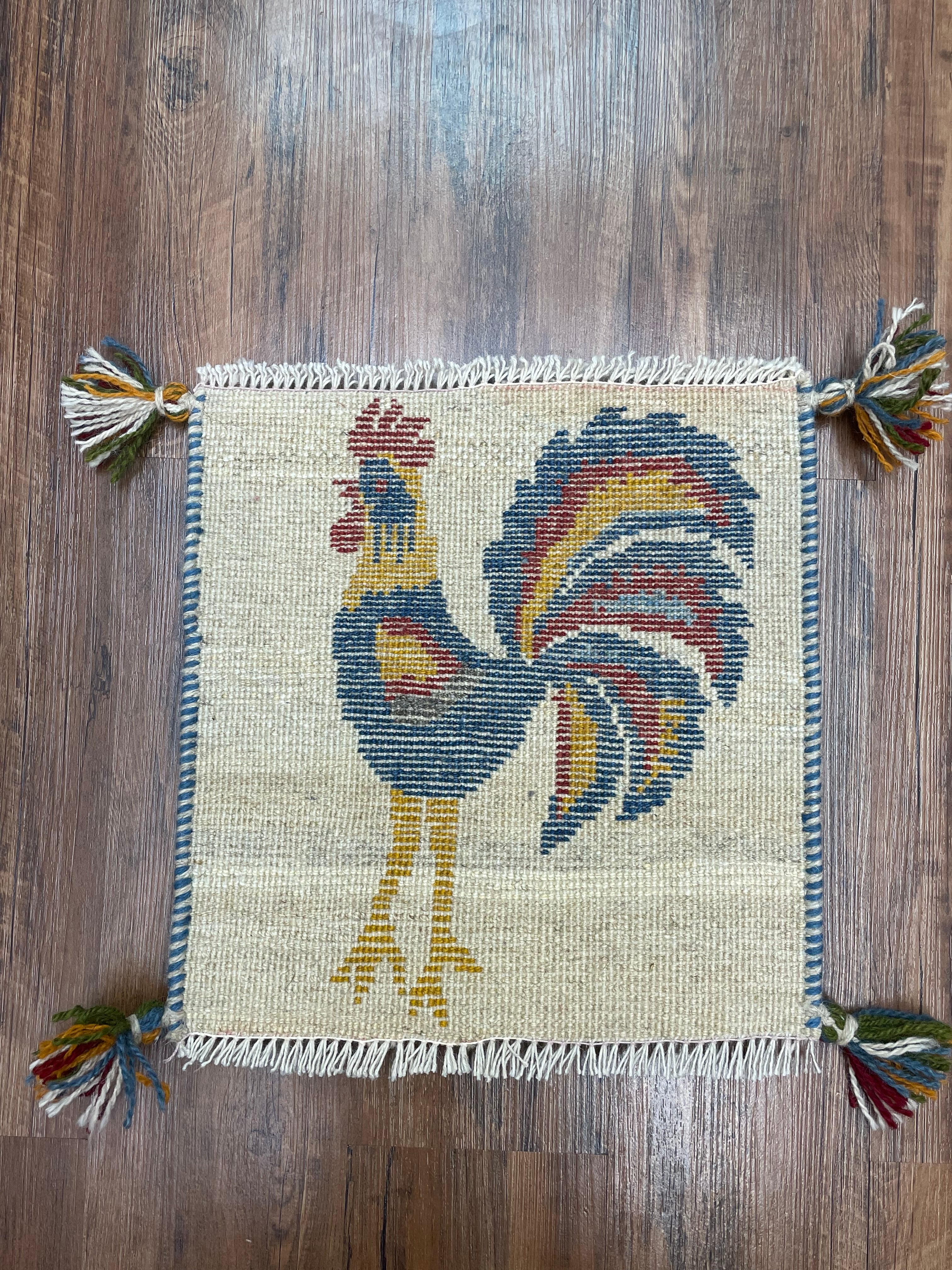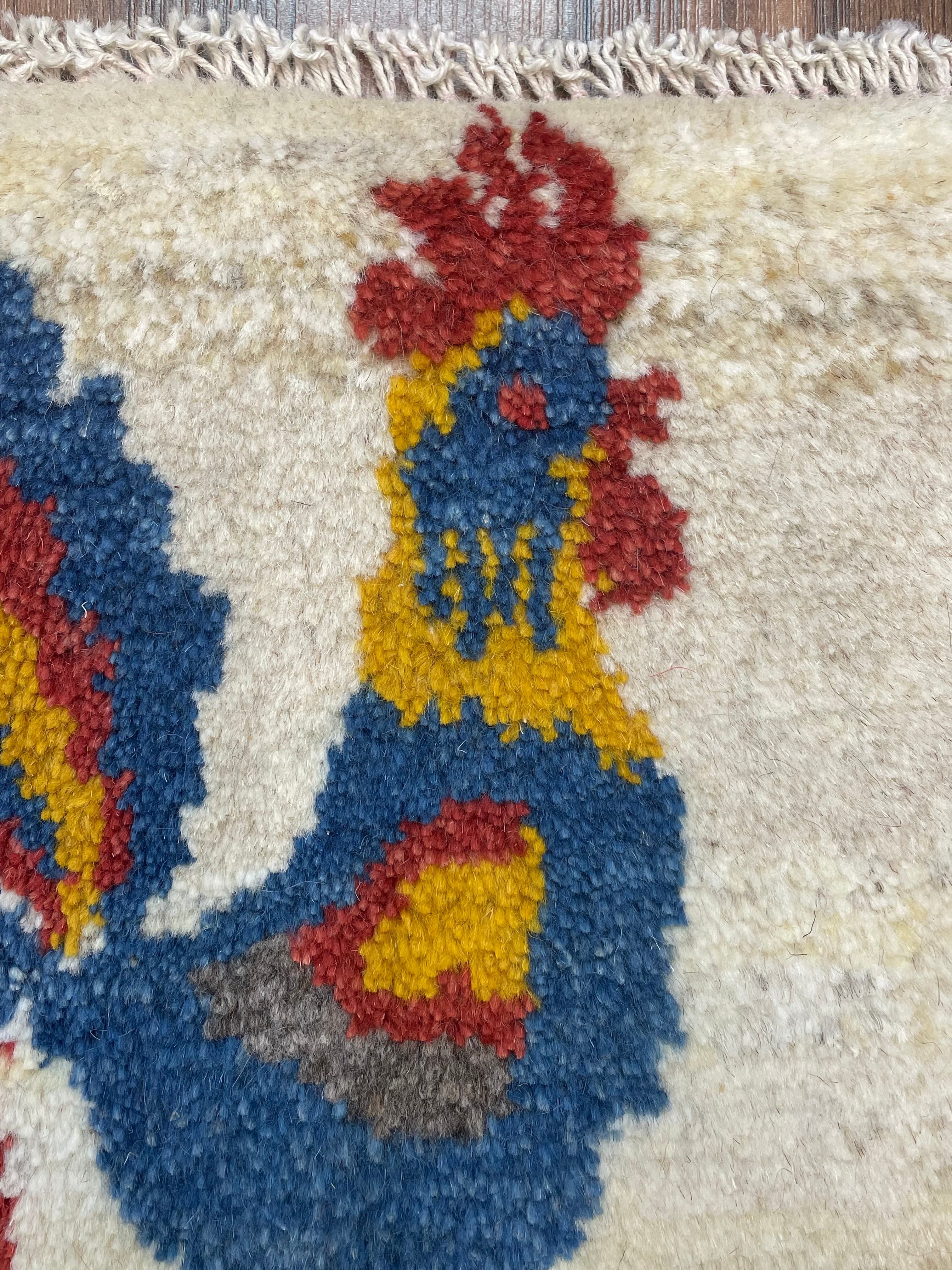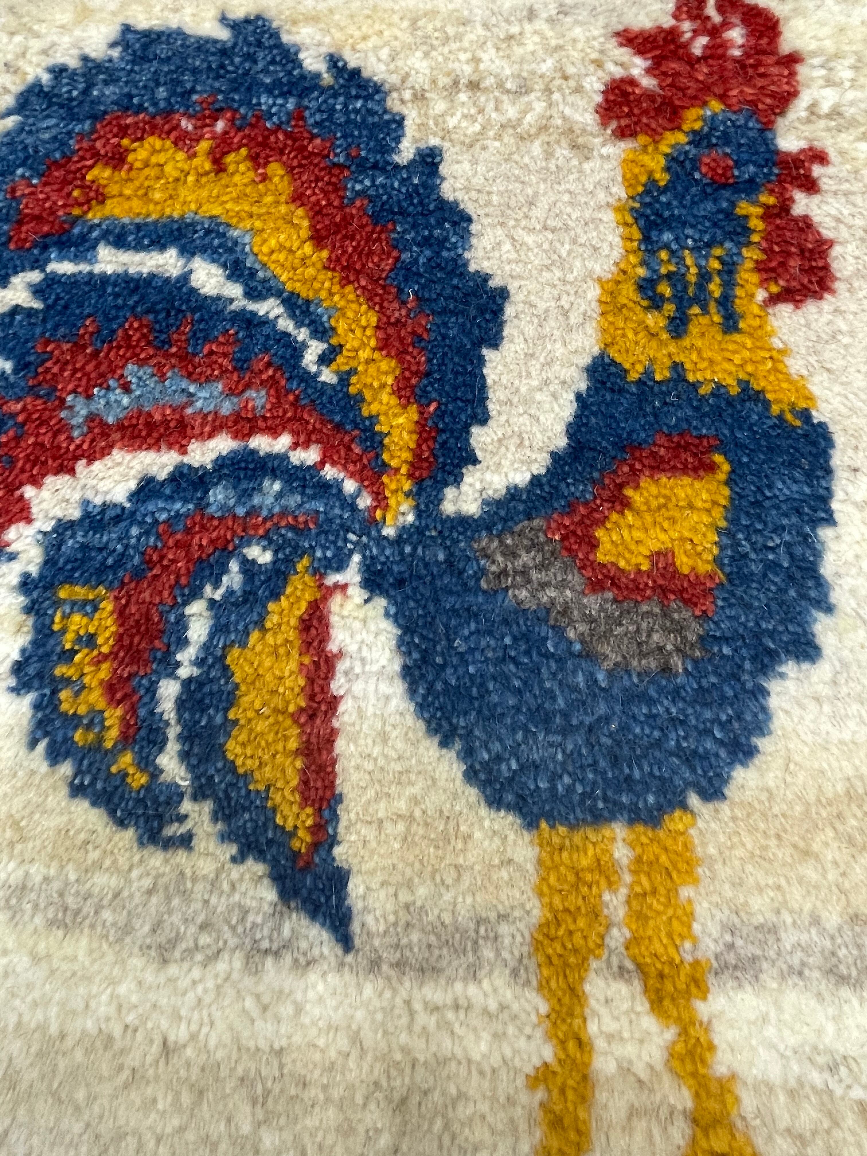 ナチュラルなフィールドにカラフルで堂々とした姿の鶏がとても印象的な座布団サイズの素敵なペルシャギャッベです。