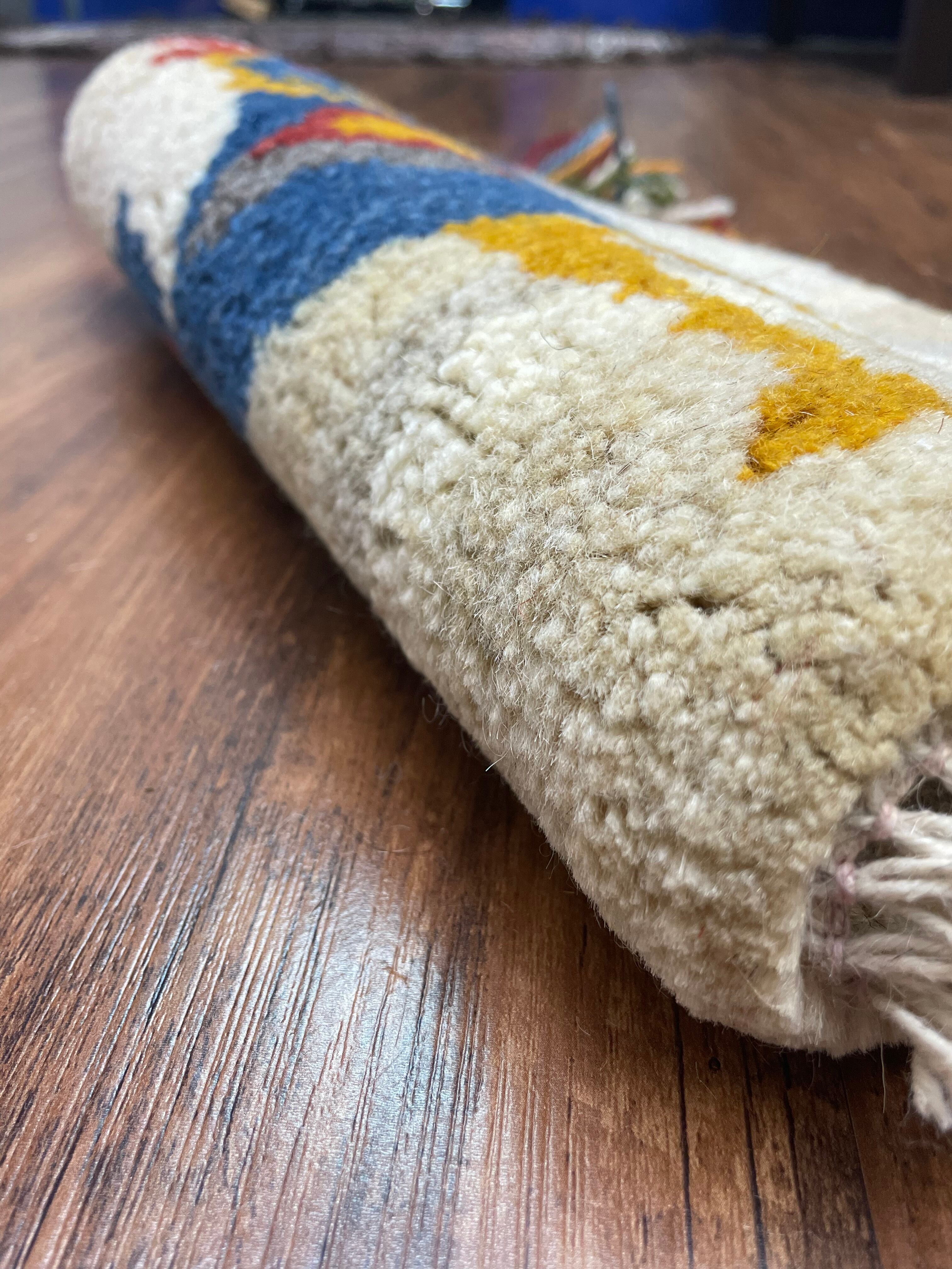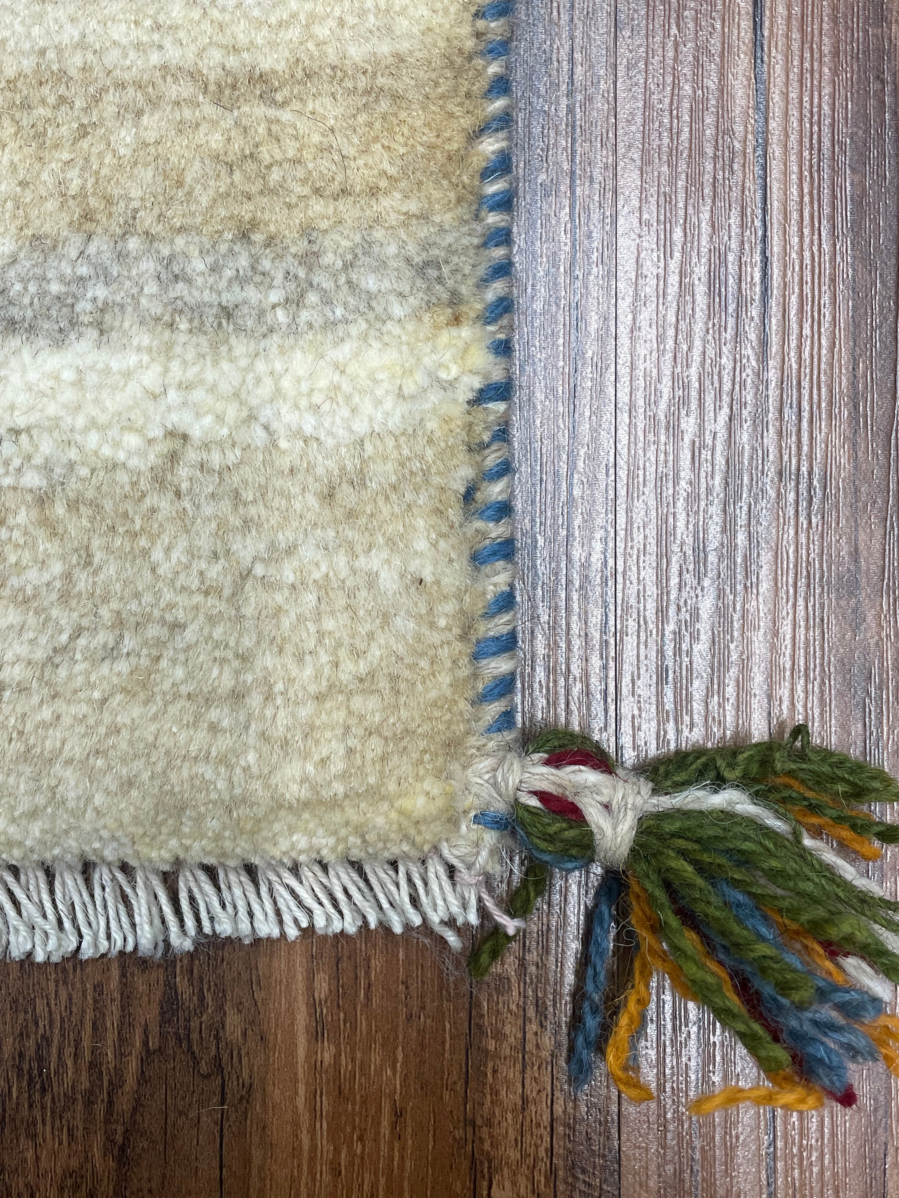 イランのギャッべの特徴は遊牧民の暮らしている地域は夏冬の温度差が大きい事に加え乾燥地帯であるため昼夜の温度差も大きい環境で育った羊の毛を刈り紡いで使っているので良質なウールで出来ていて手触りが良いです。