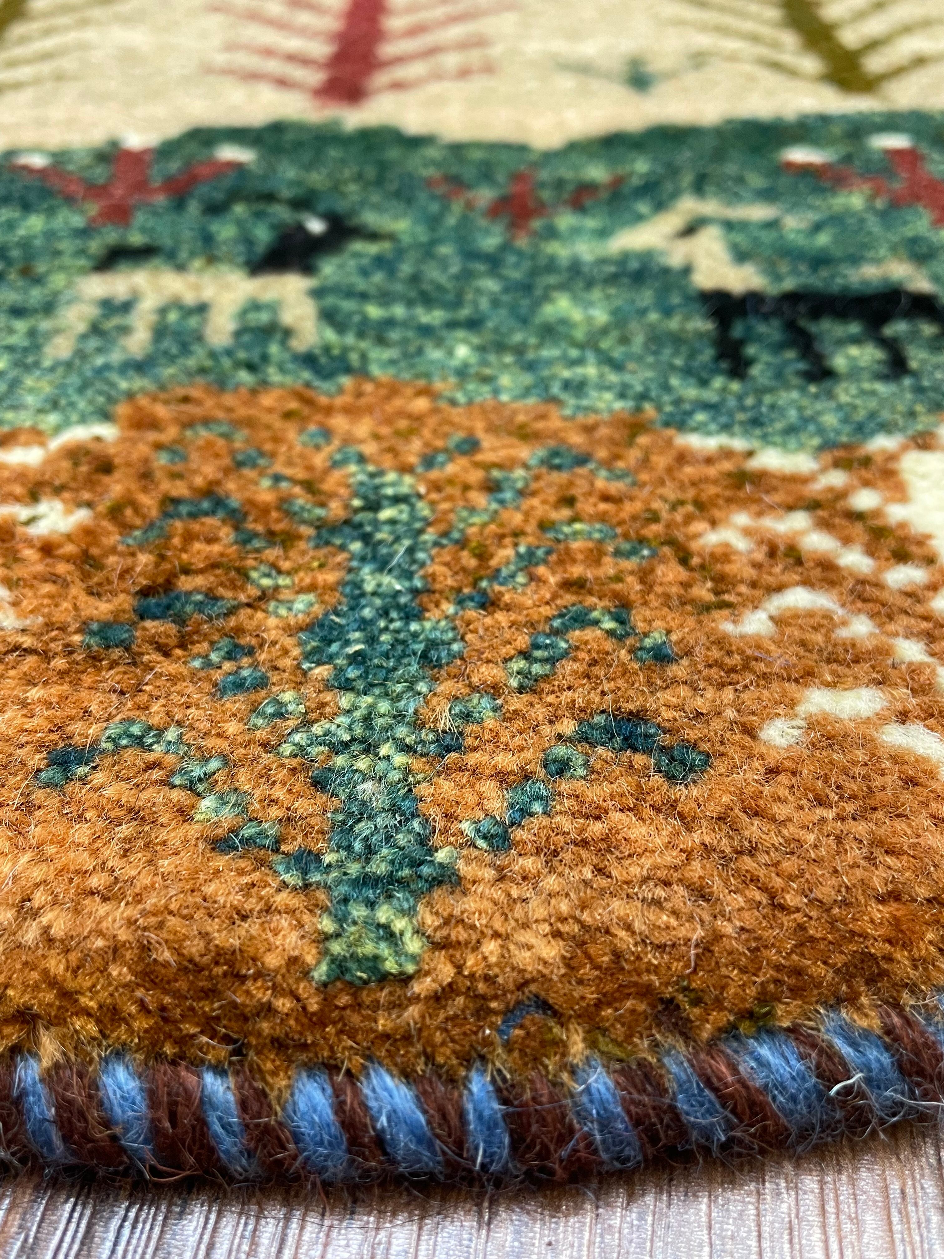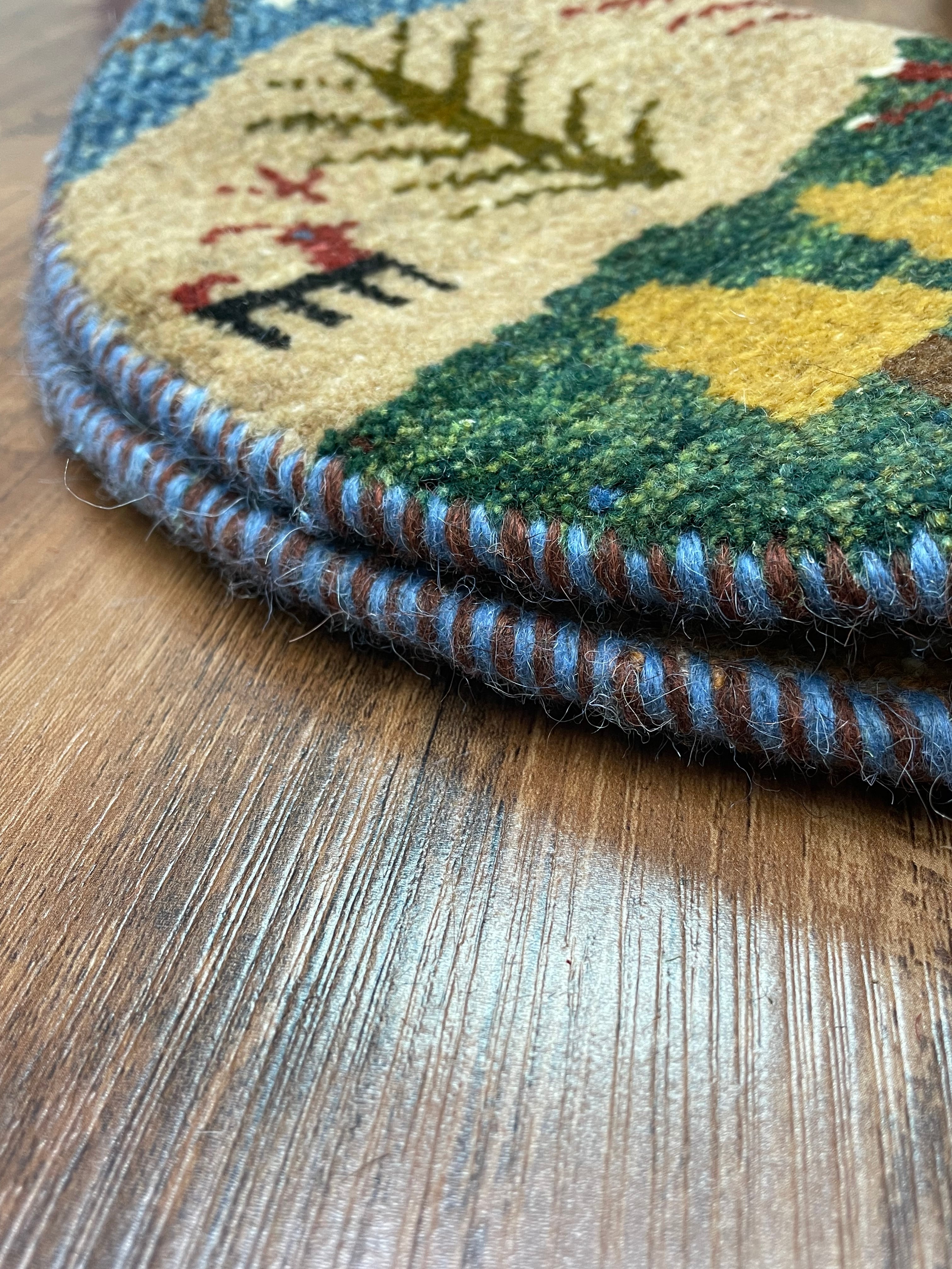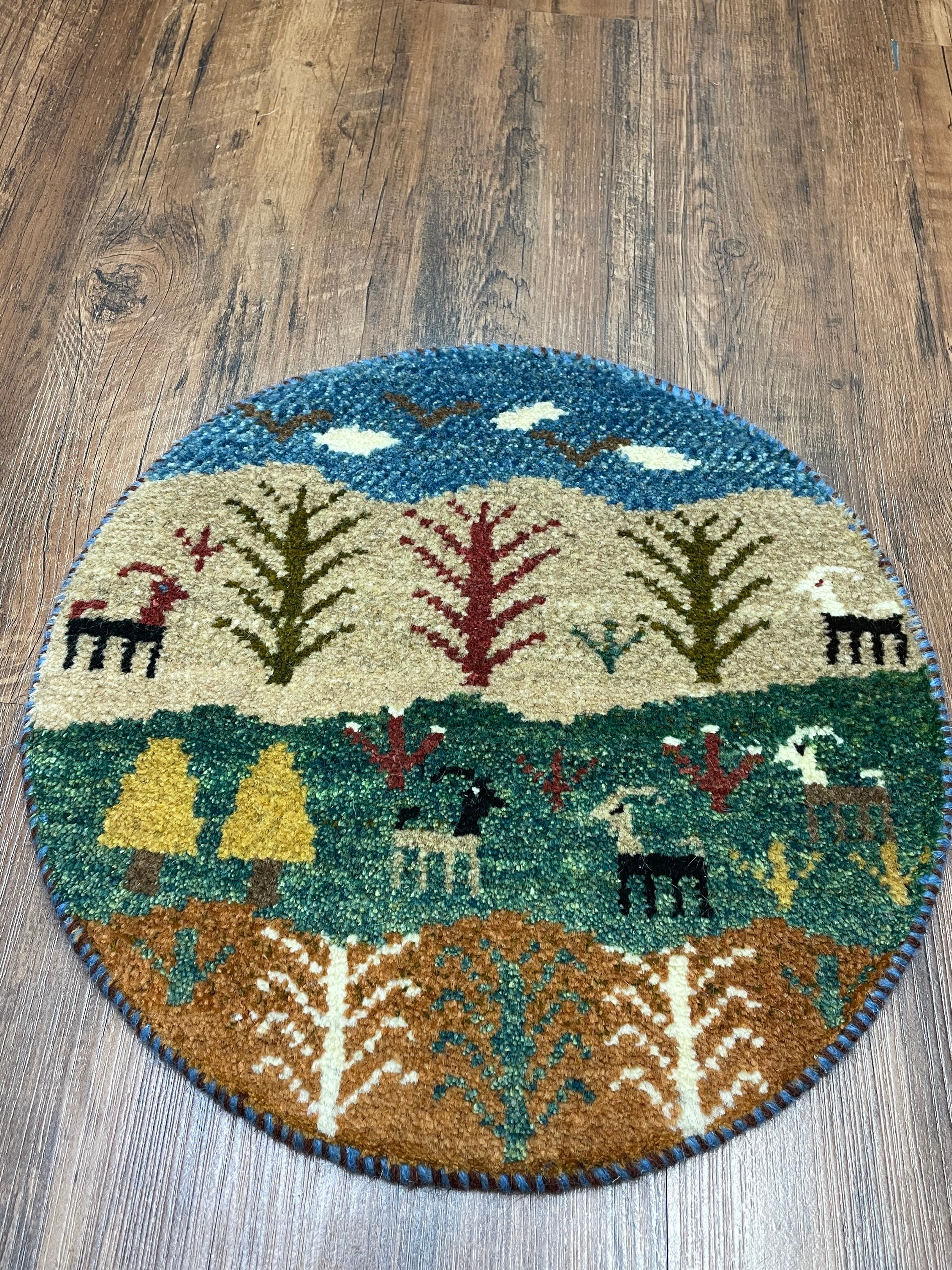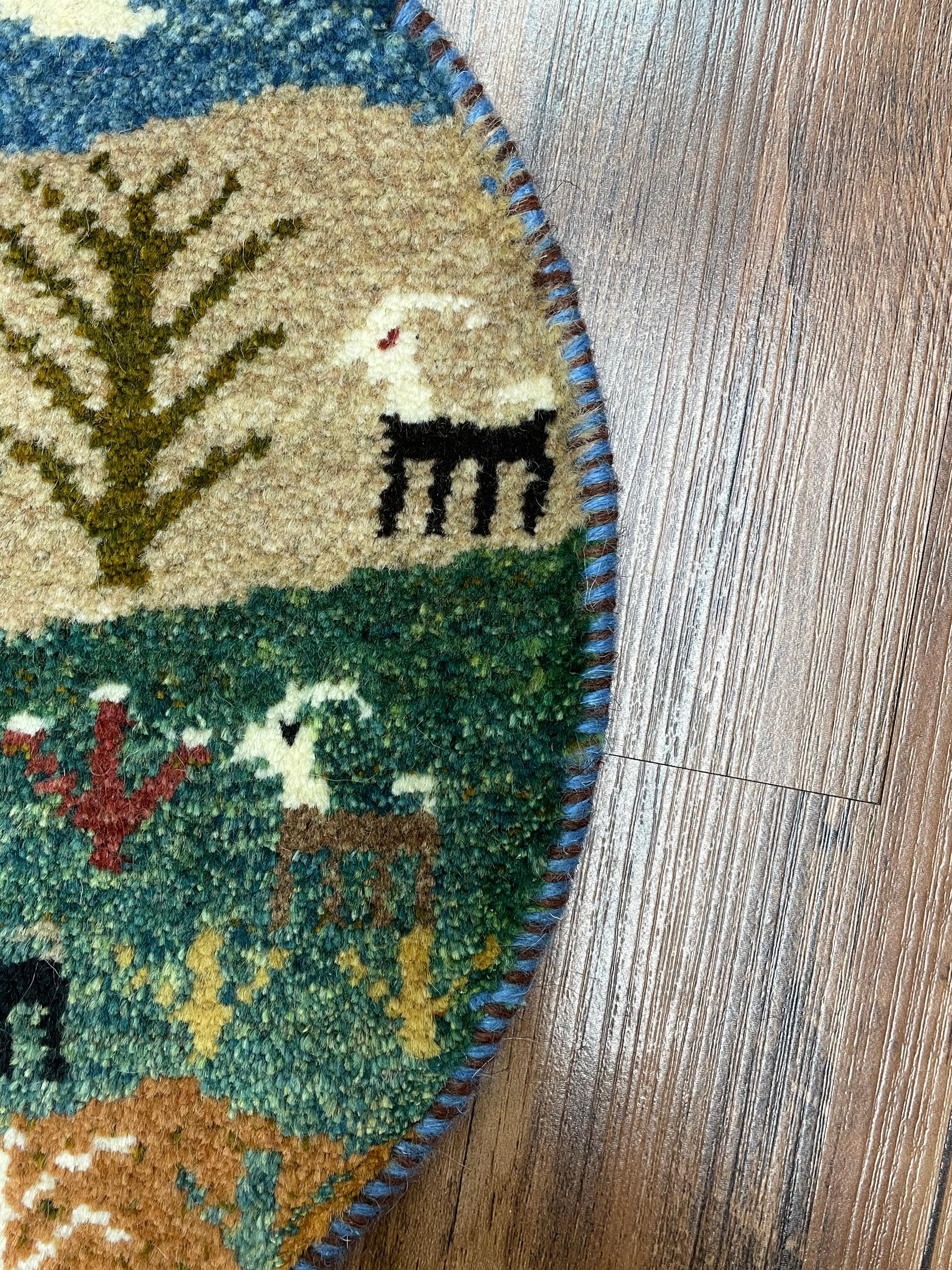 新品 ペルシャ絨毯 手織り ギャッベ 円形 39cm 風景 山羊 生命の木