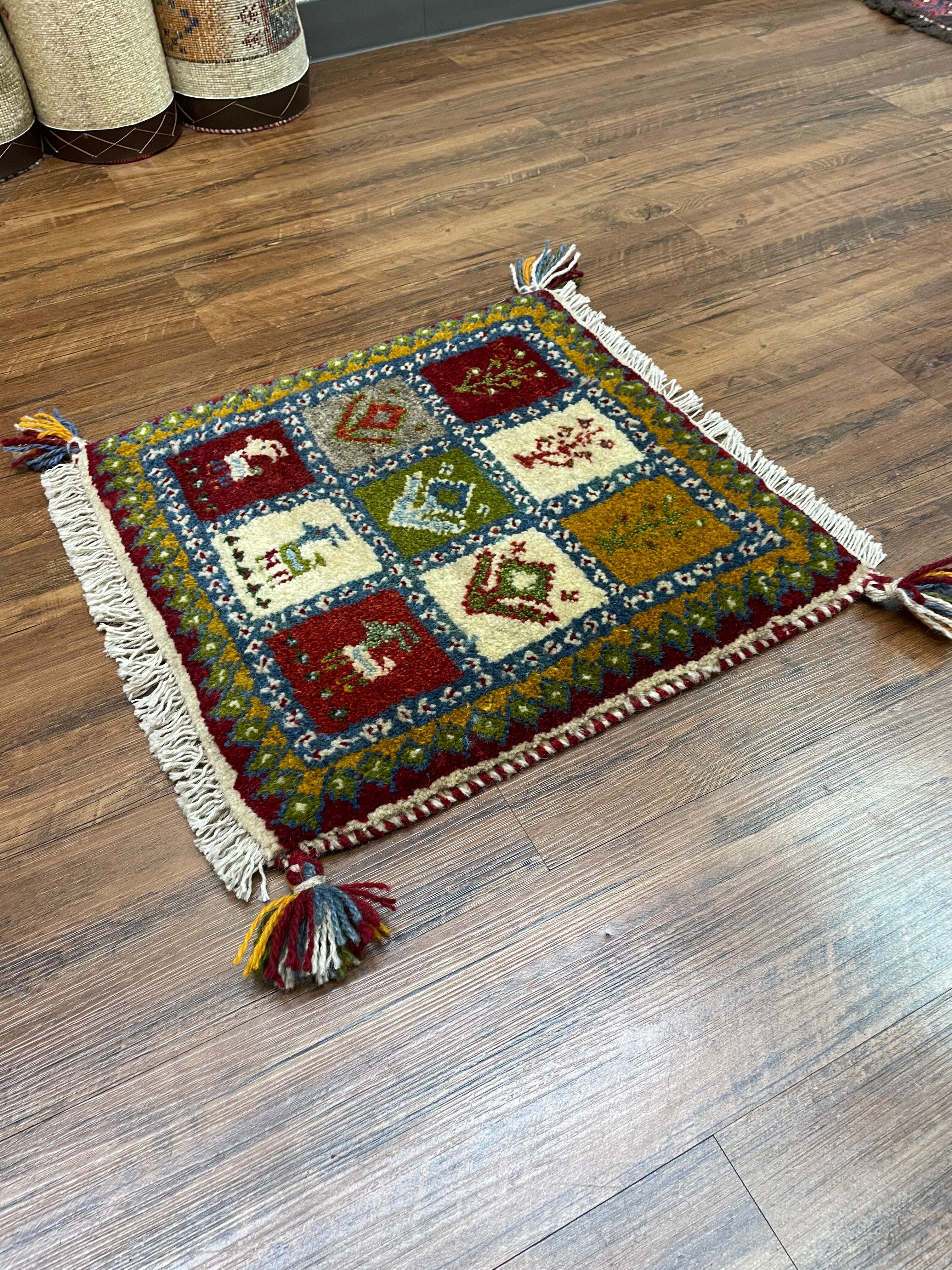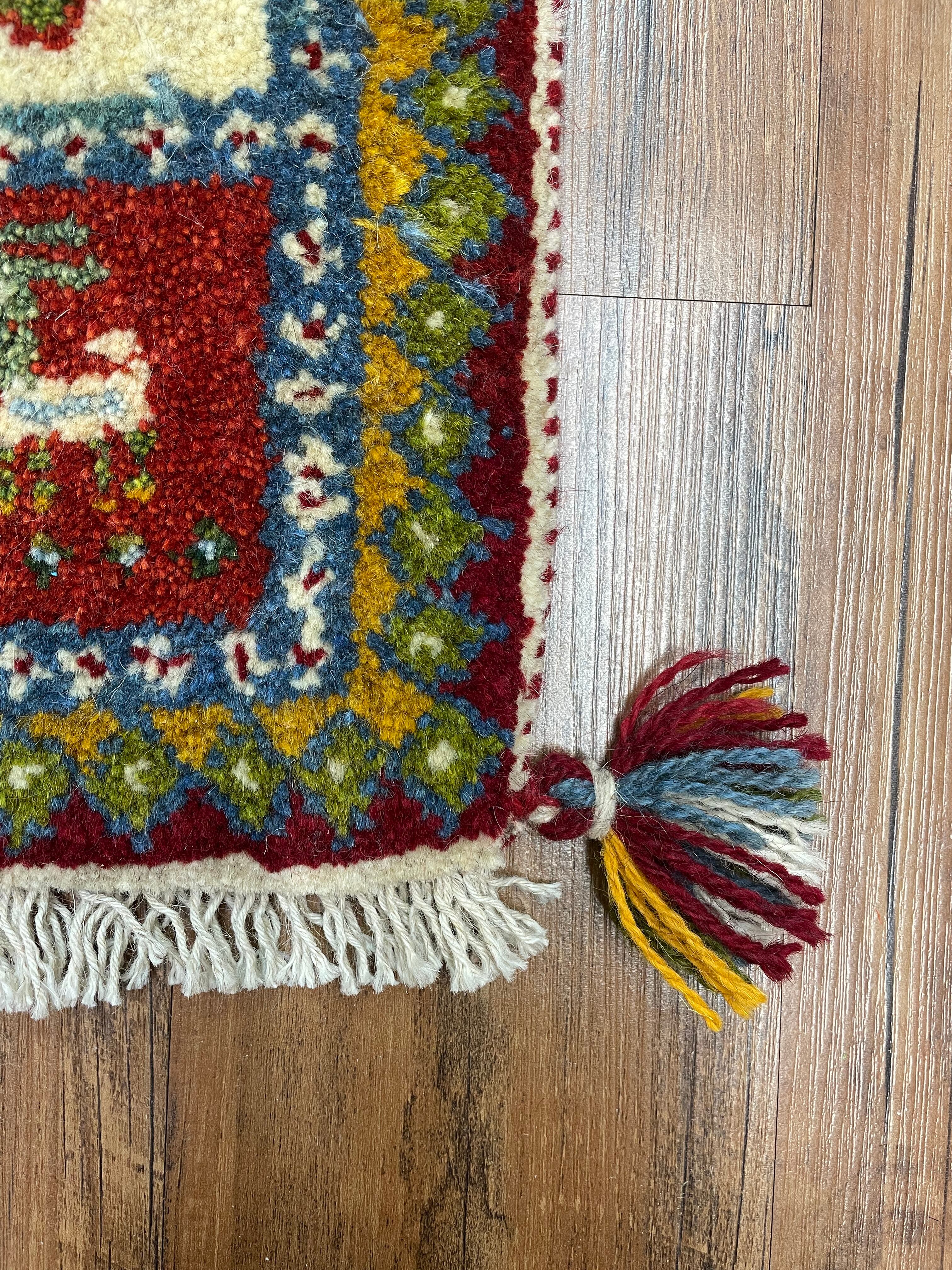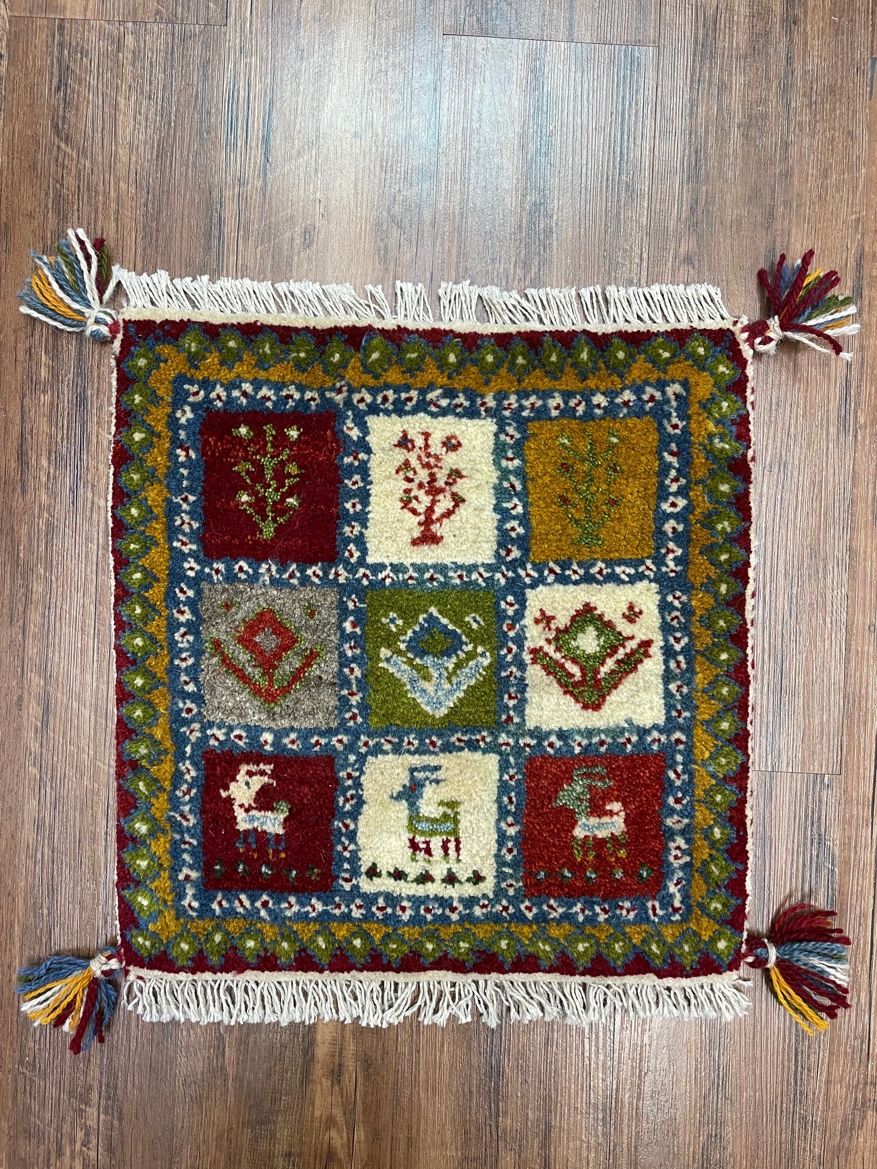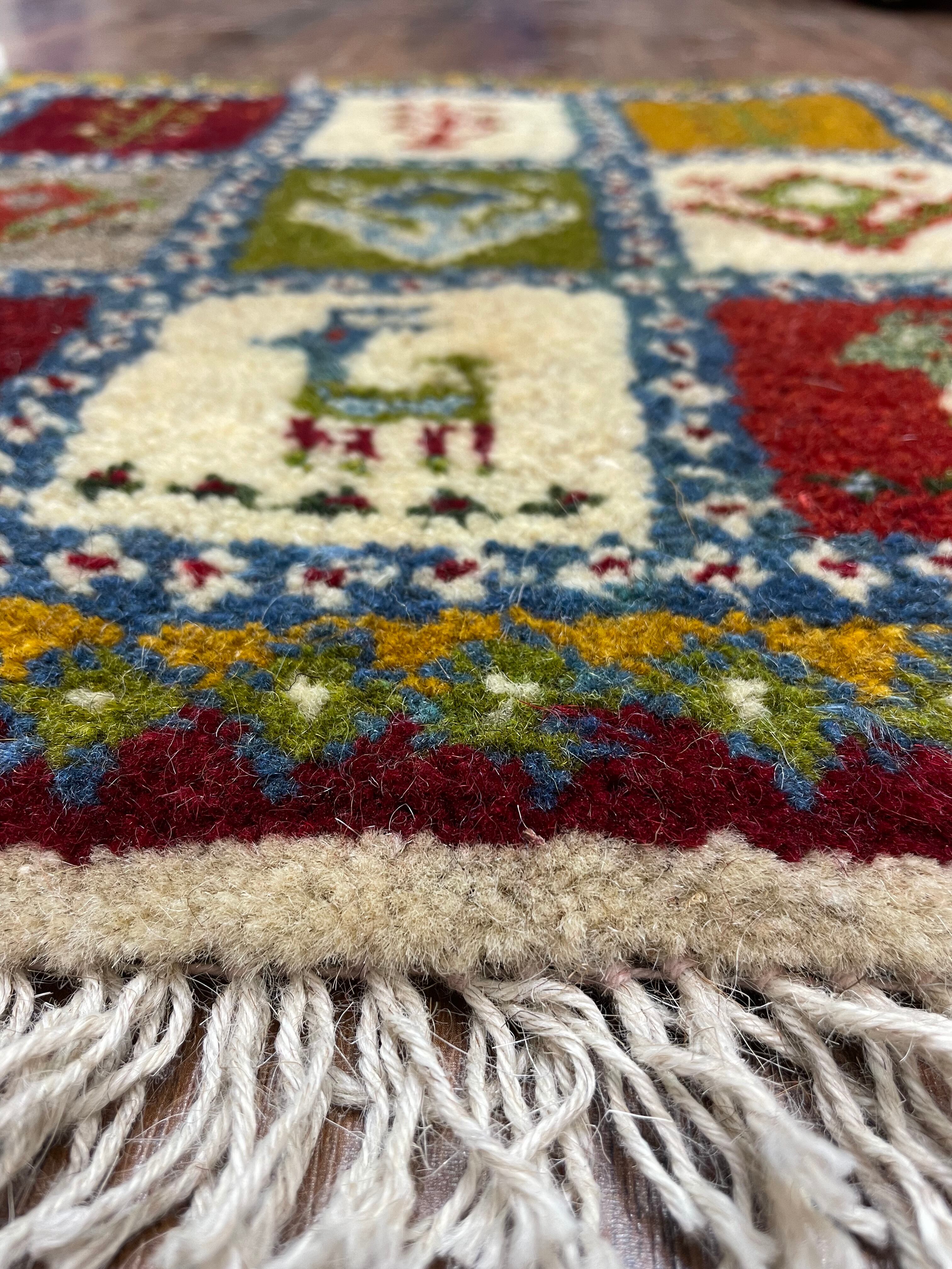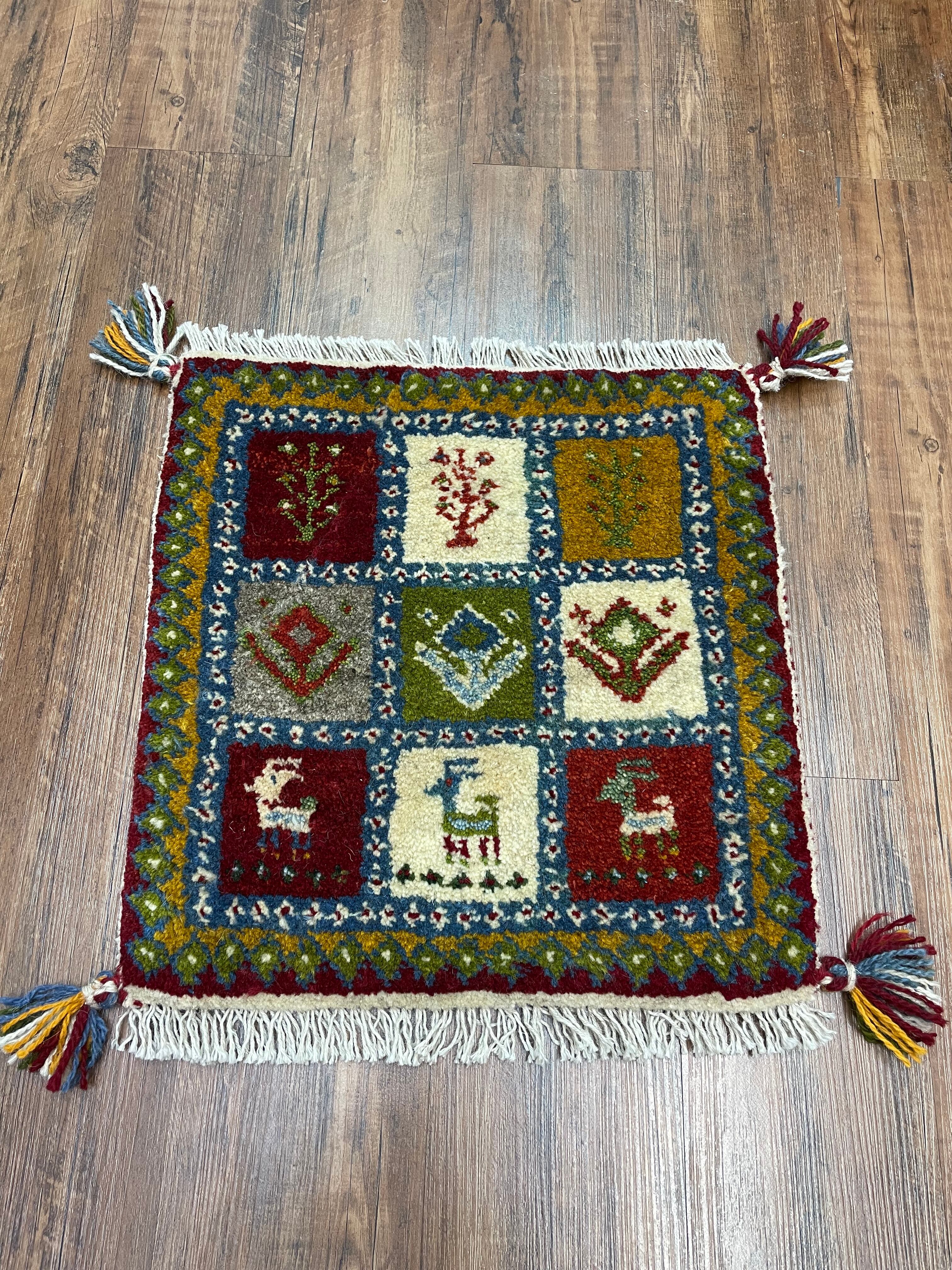 パネルの中に花や鹿が織り込まれ縁取りも可愛らしく色の組み合わせも素敵な座布団サイズの手織りペルシャギャッベです。